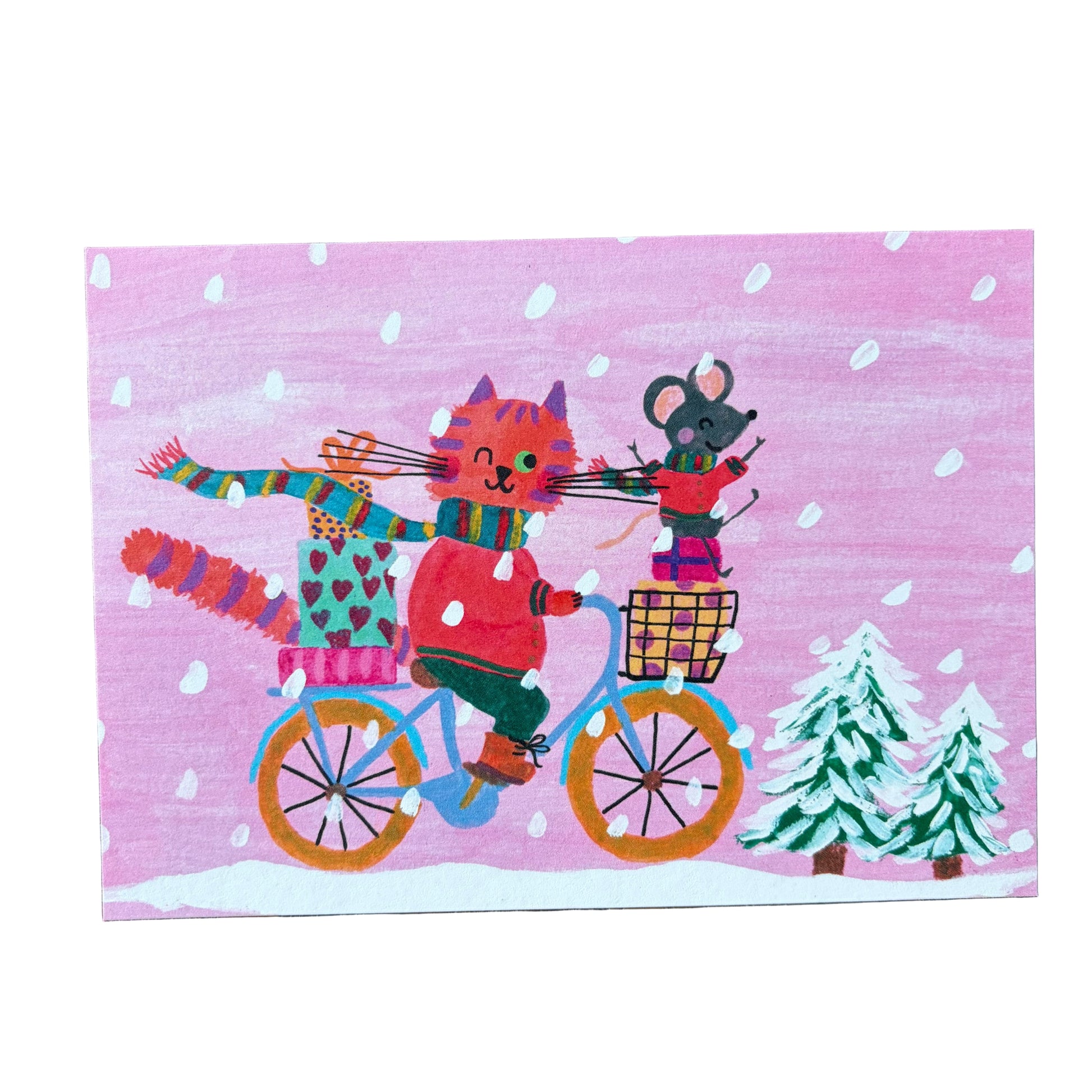 - Kaart Poes en muis op de fiets met cadeautjes in de sneeuw.