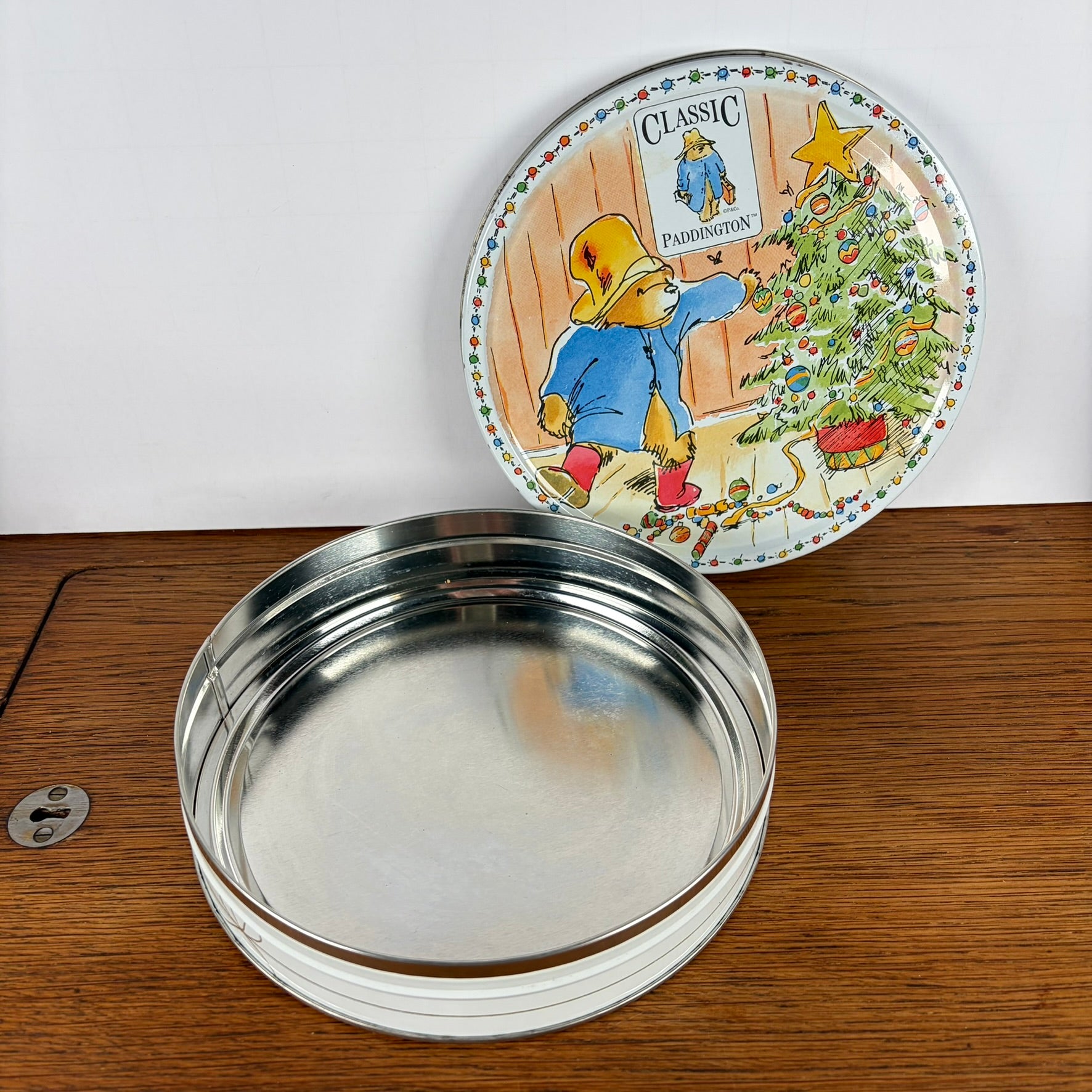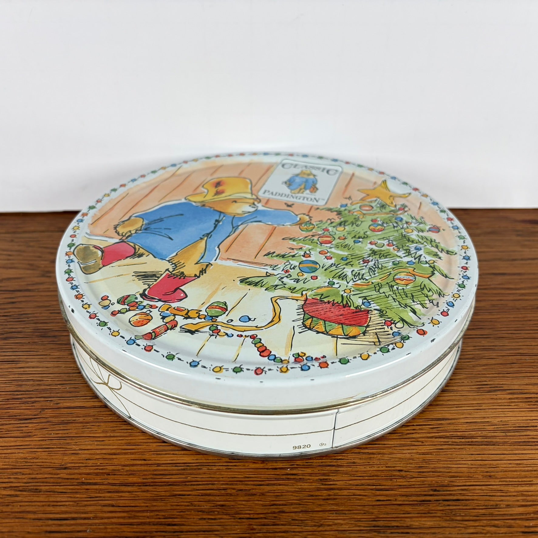 - Rond plat kerst blik van beertje Paddington met een kerstboom.