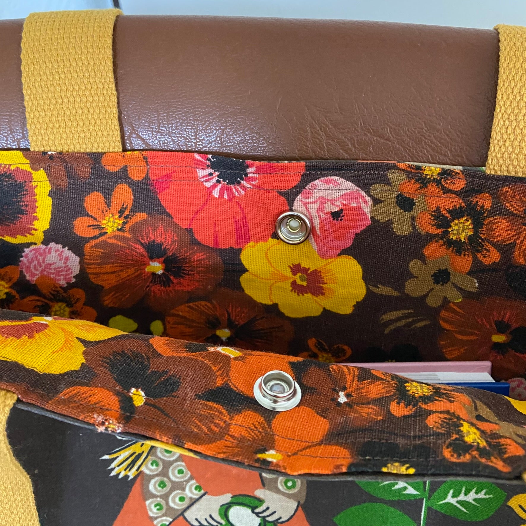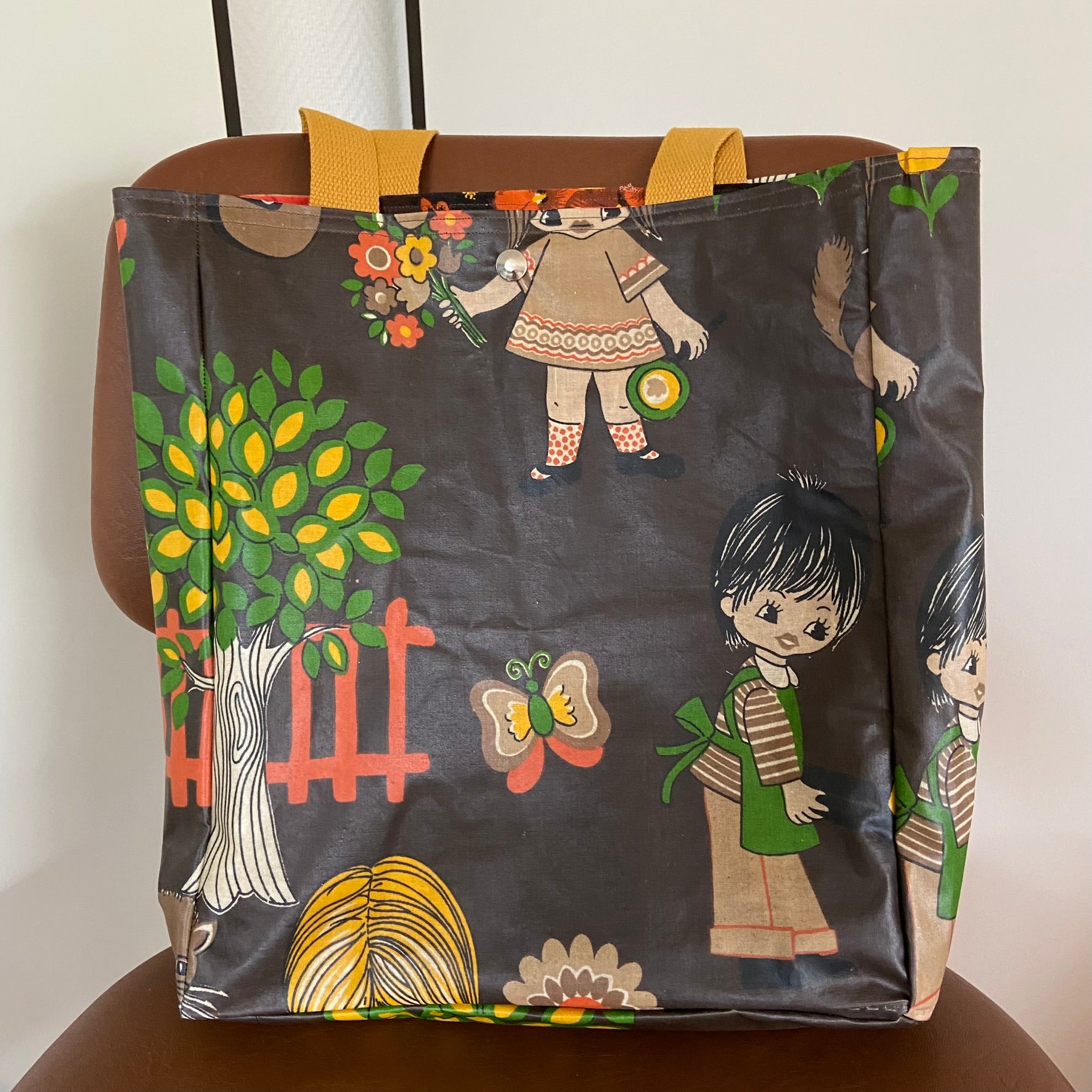 - Deze prachtige tas is bruin met kindjes, een kat, en bloemen in de tuin