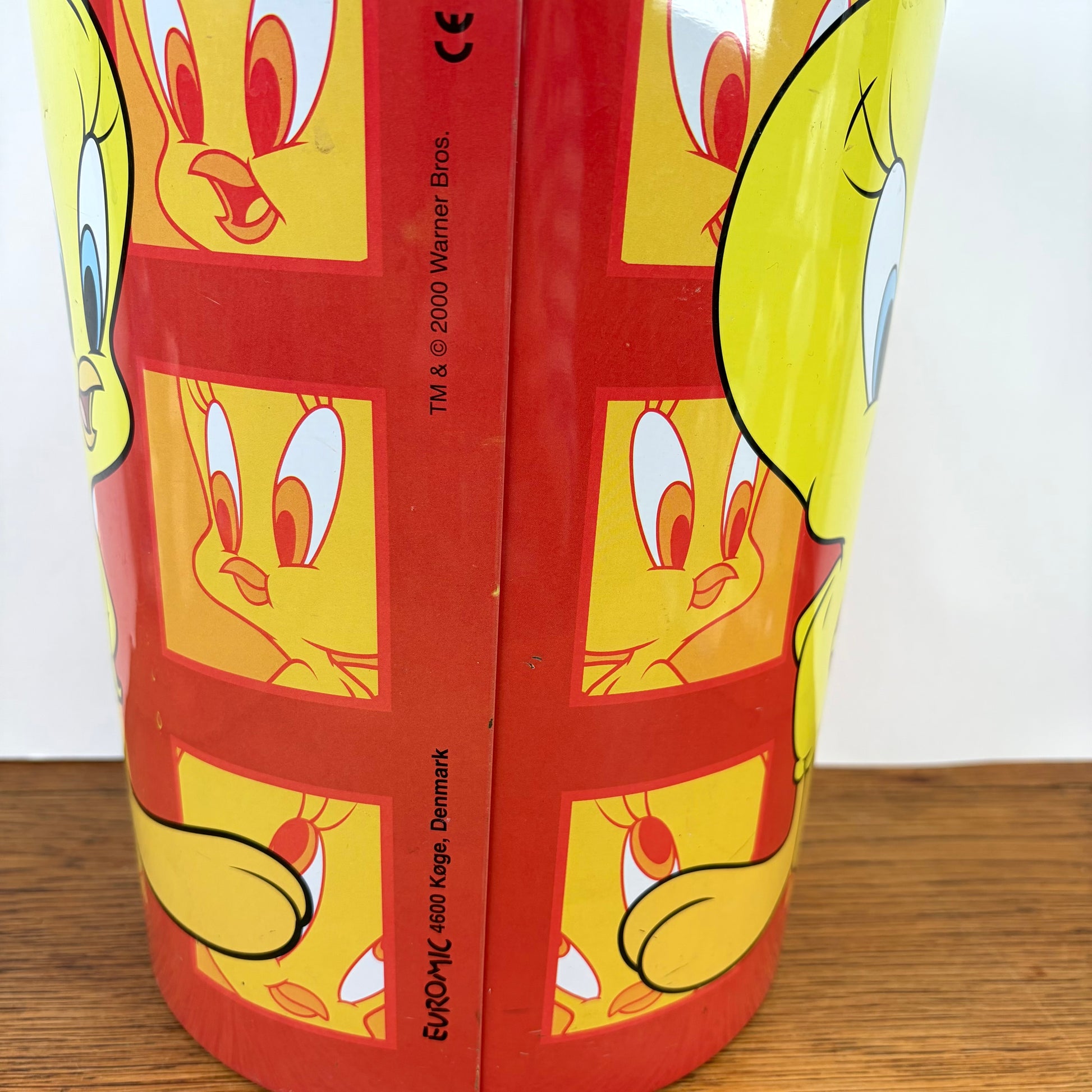 - Vrolijke rode prullenbak met een knalgele Tweety.