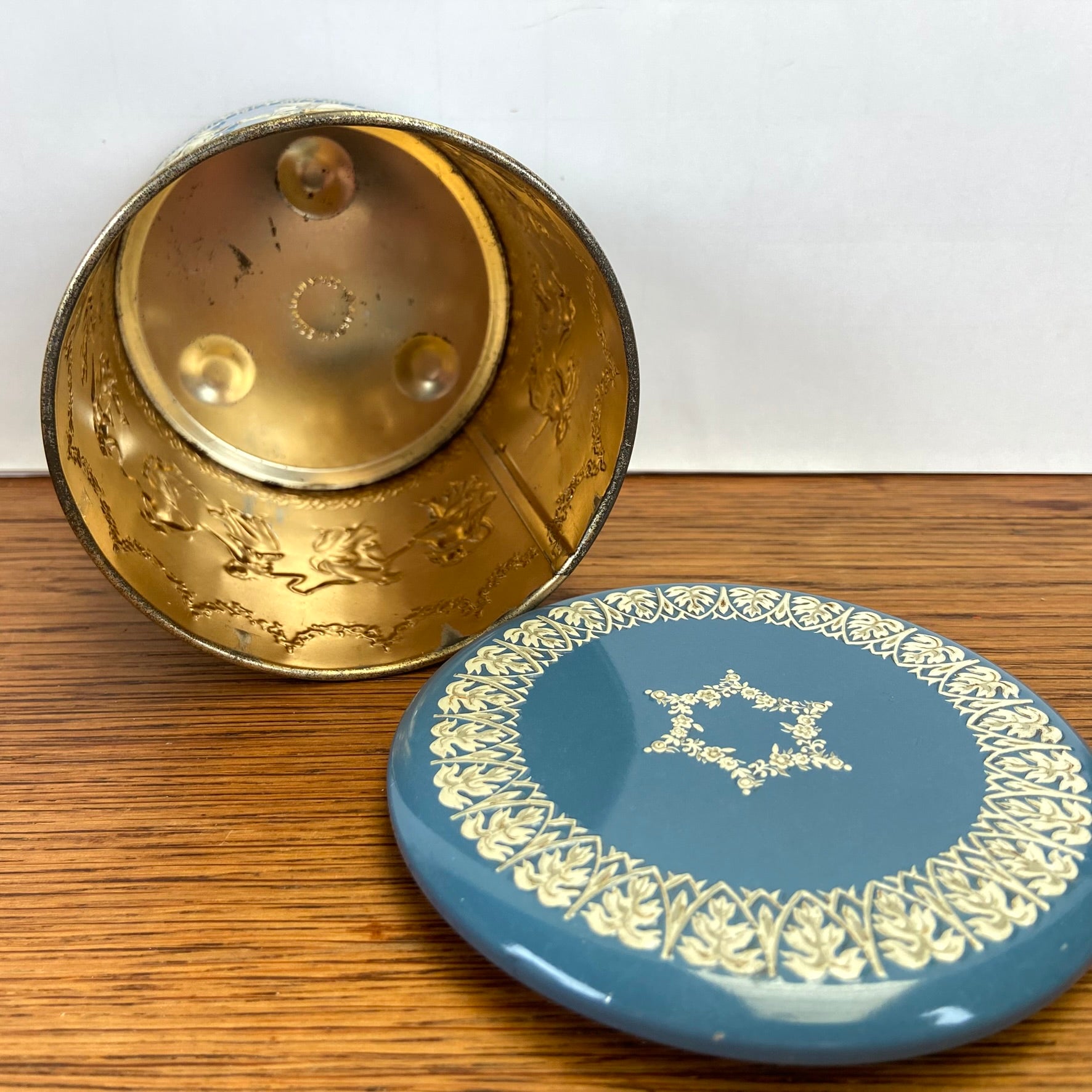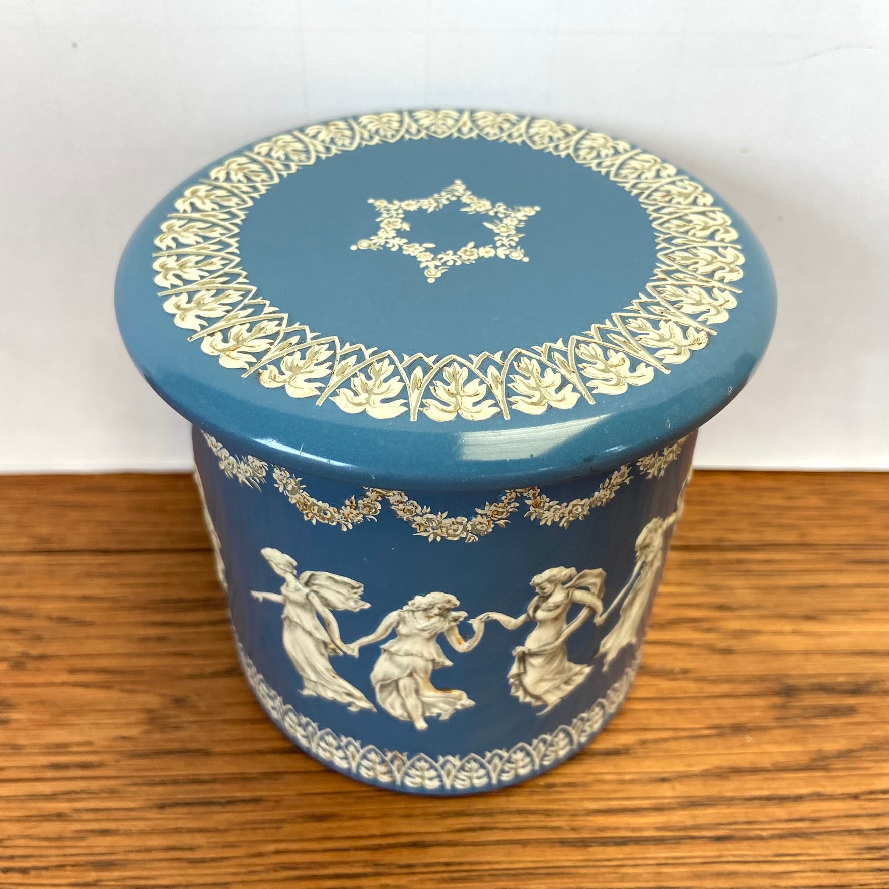 - Prachtig lichtblauw koffieblik met godinnen, vrouwfiguren, danseressen rondom.
