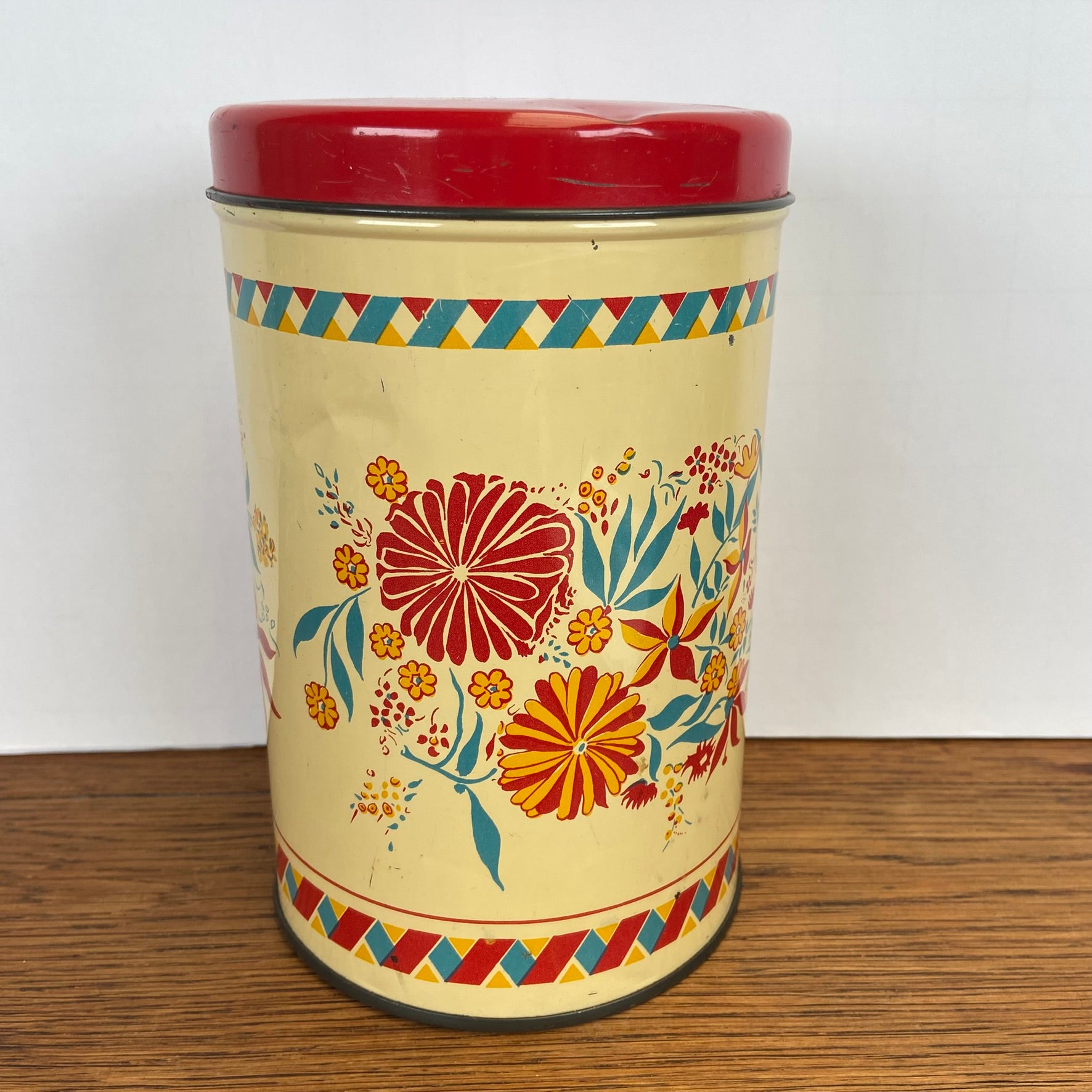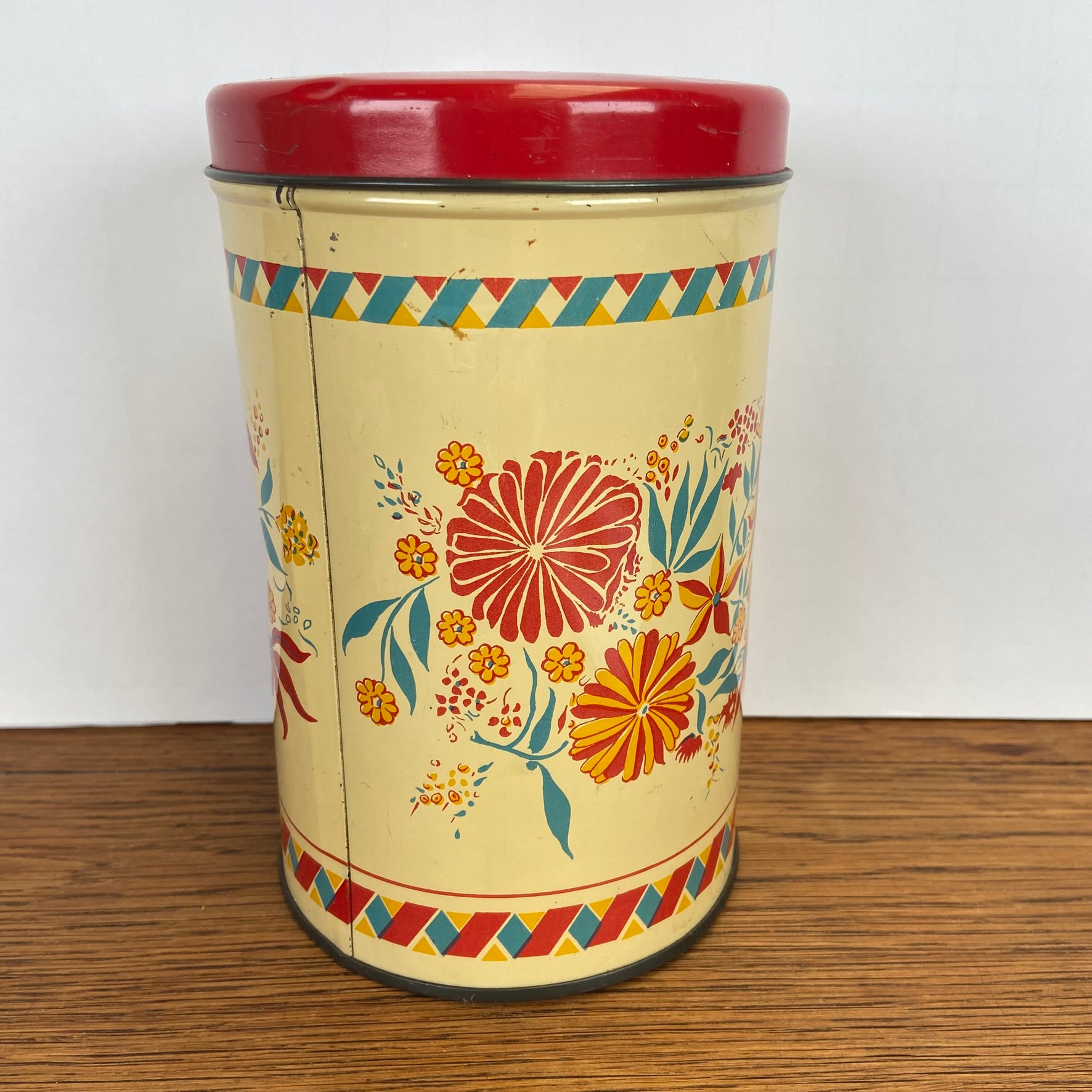 Vintage blik bloemen rode deksel