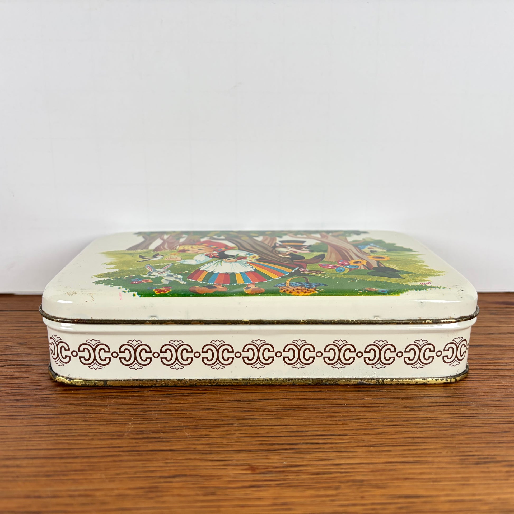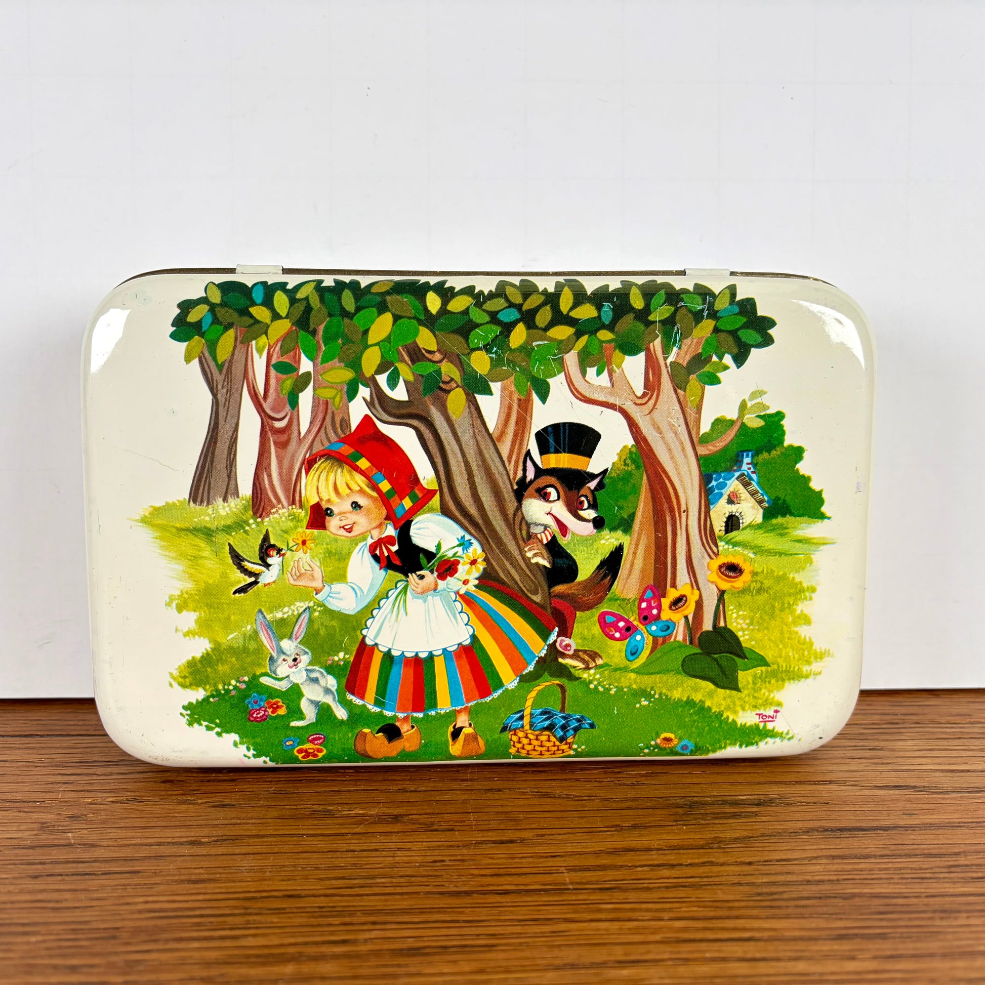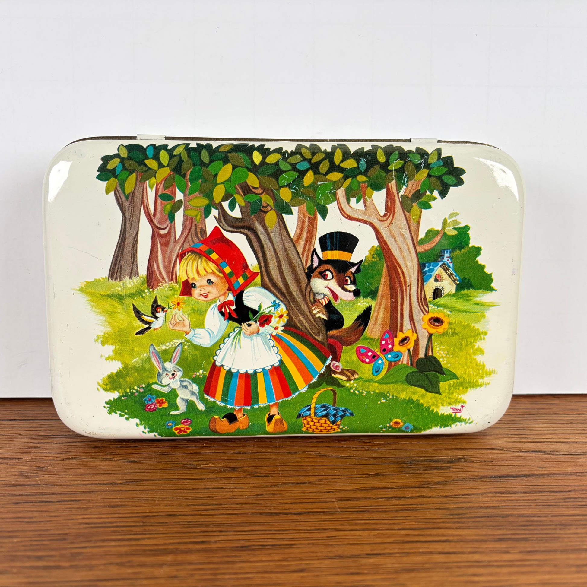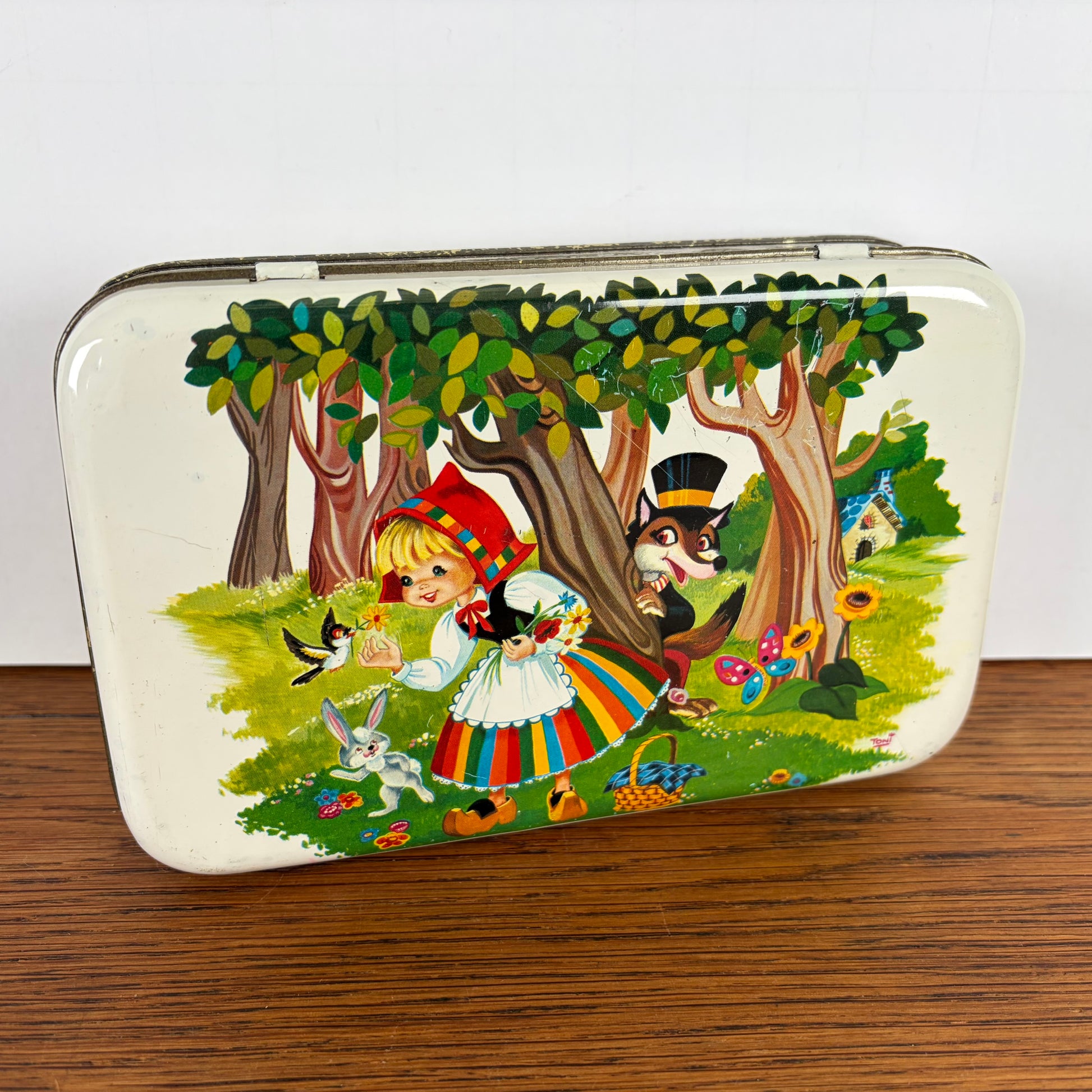 - Vintage bewaar blikje met een prent van roodkapje en de wolf.