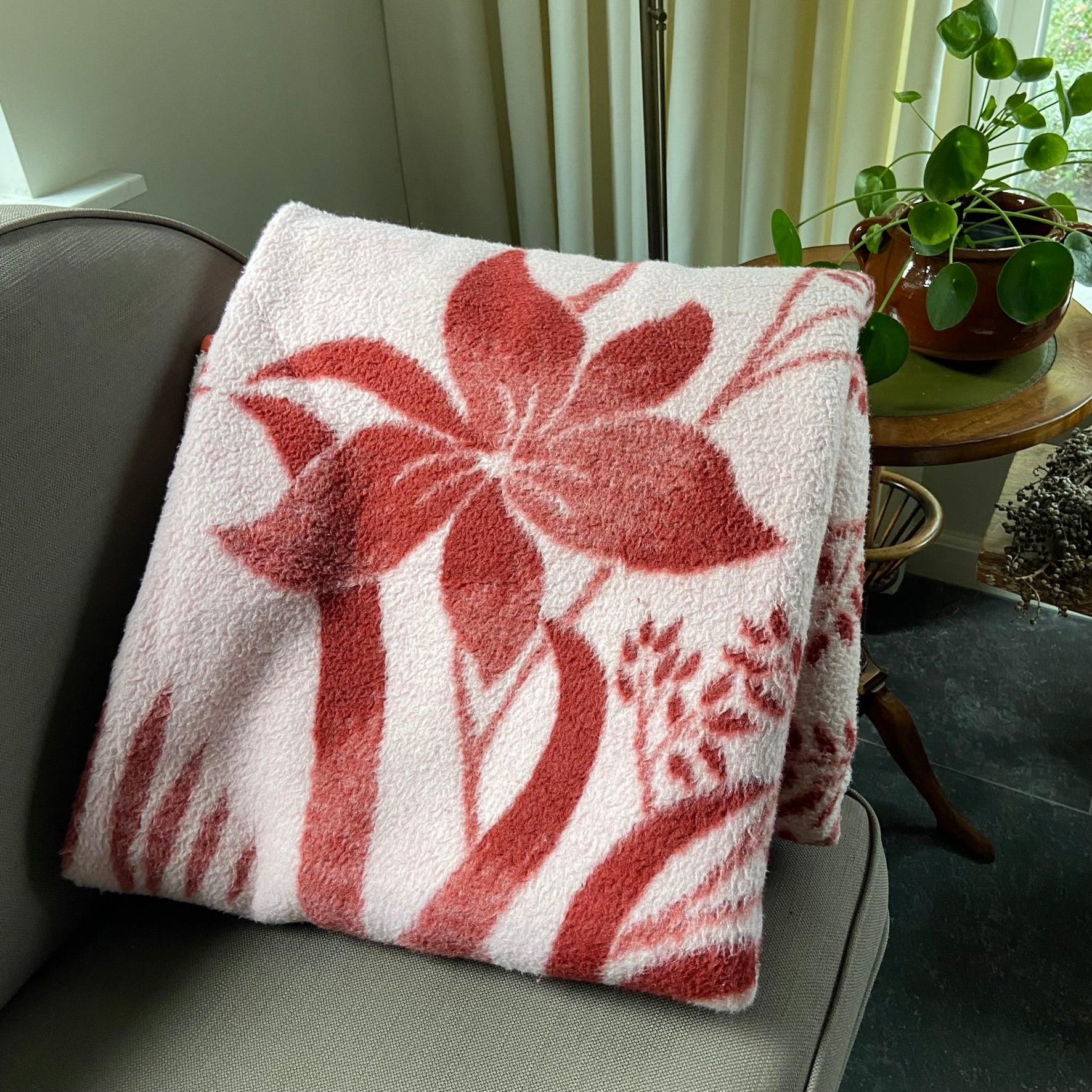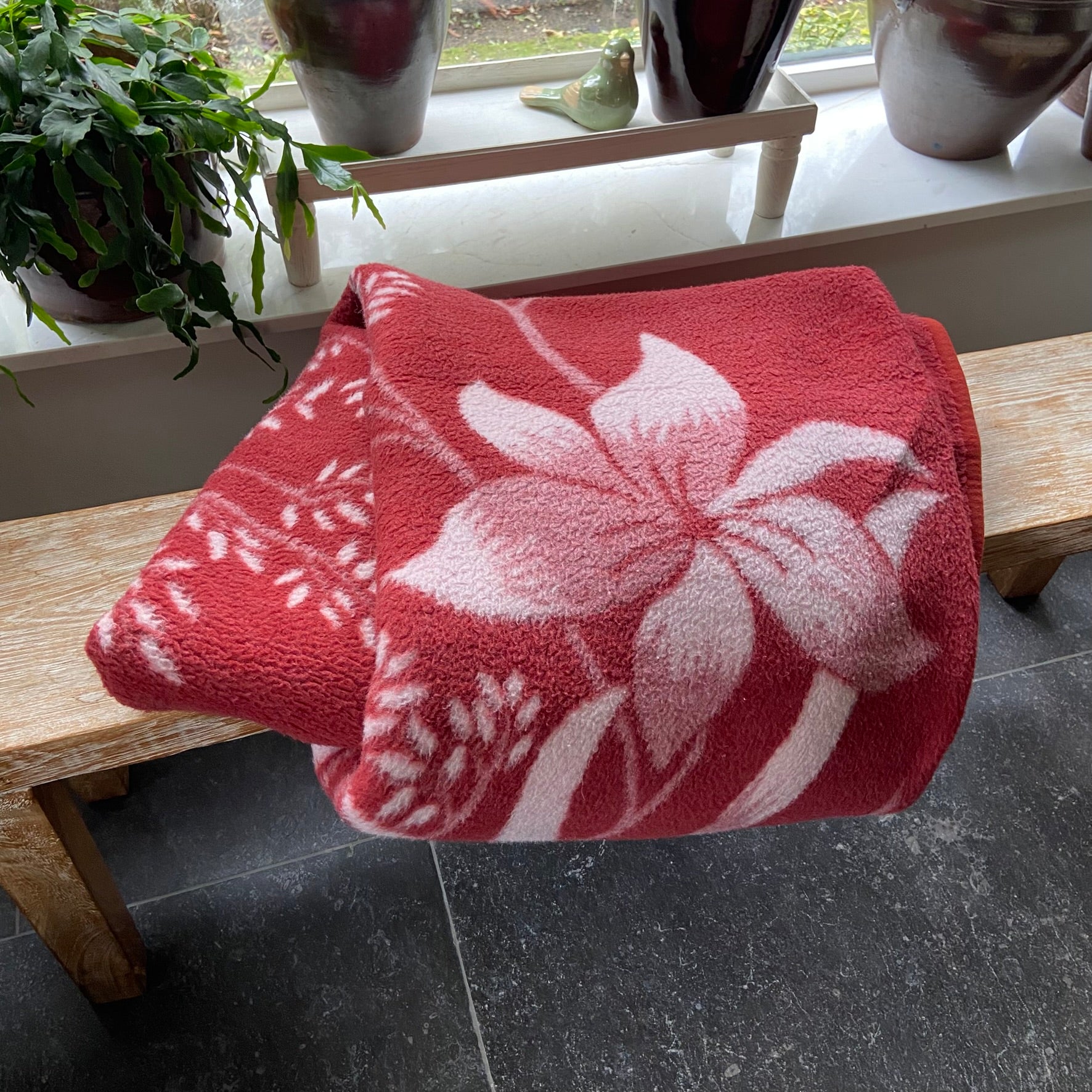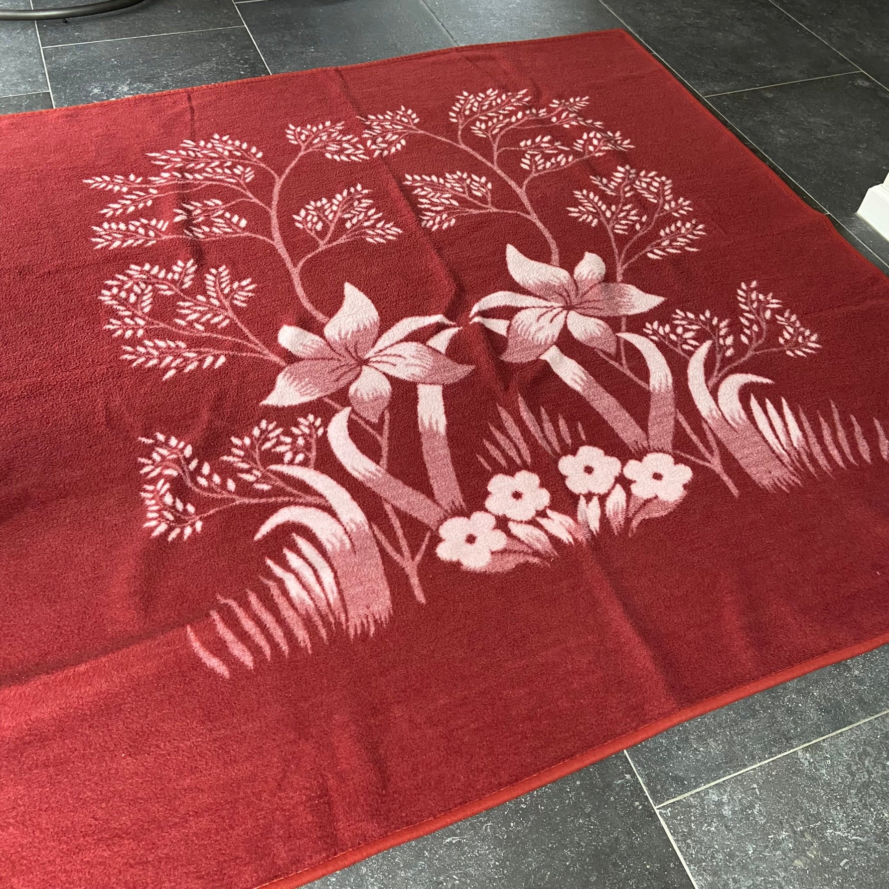 - De deken heeft een mooie aubergine, bordeaux rode kleur met wit/creme bloemen.