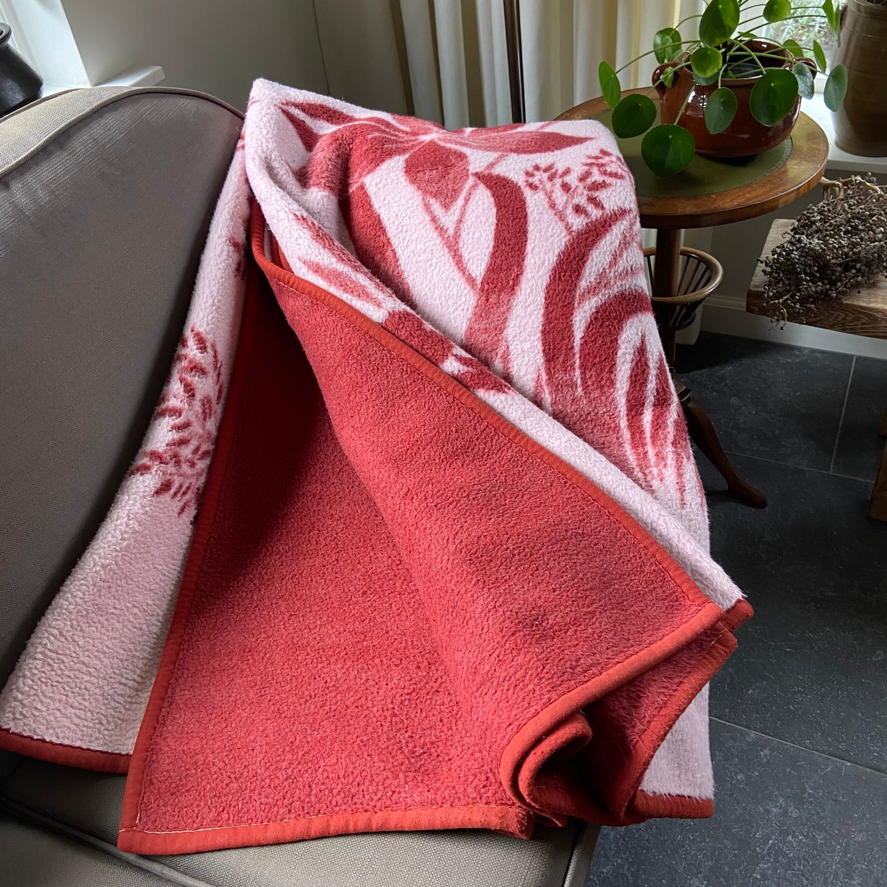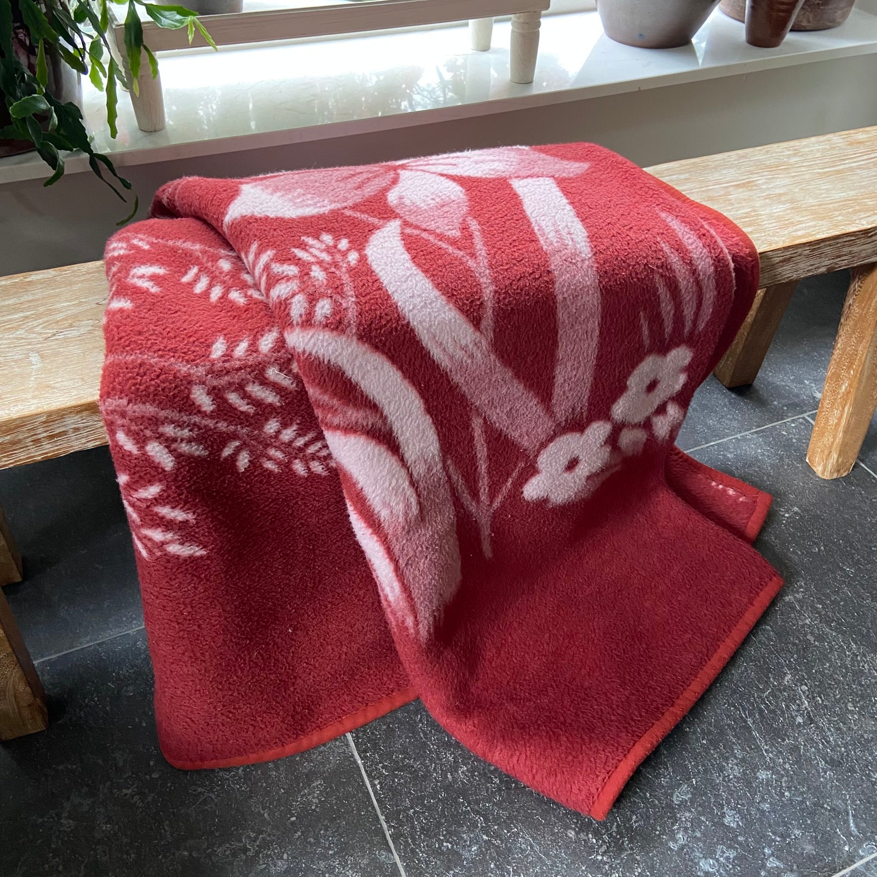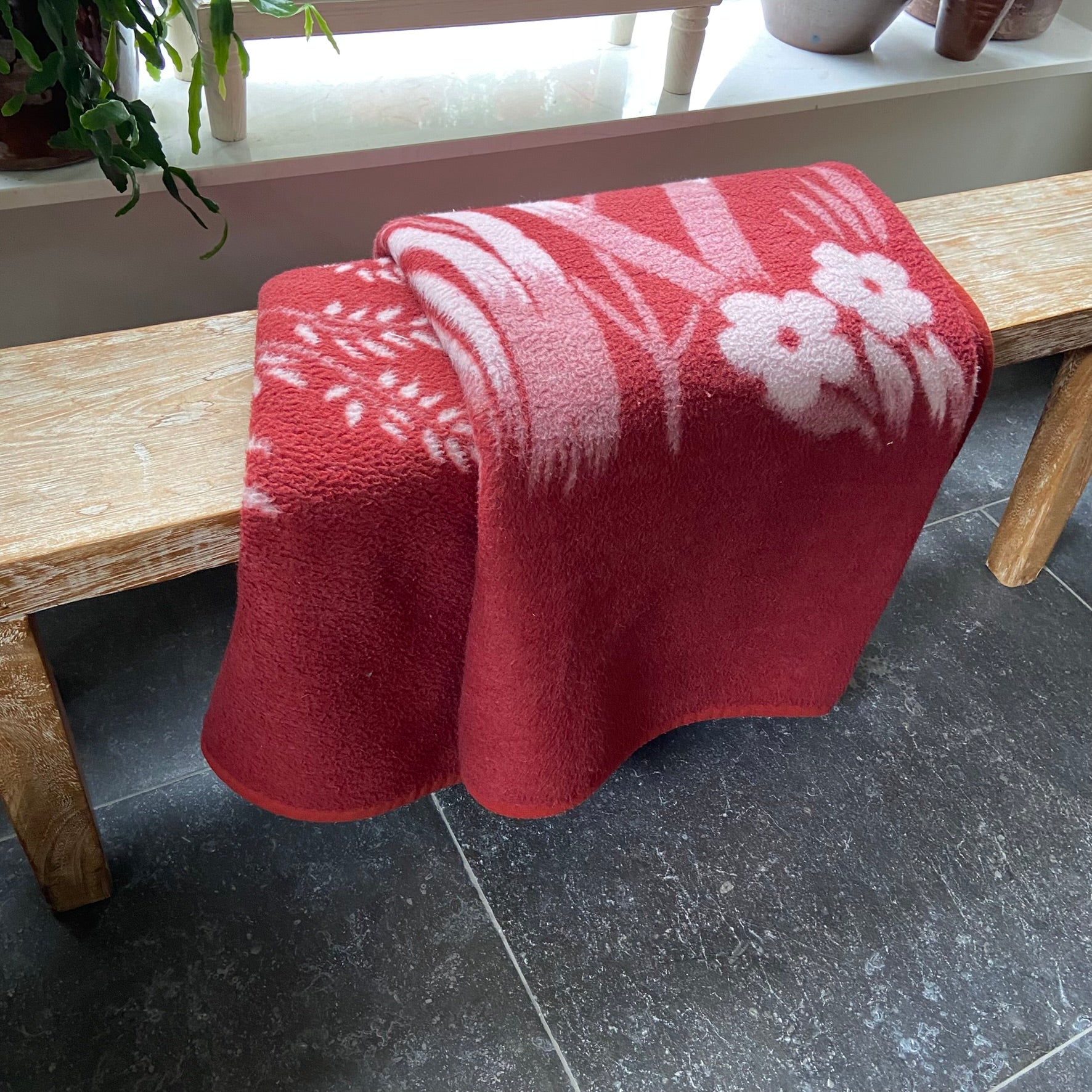 - De deken heeft een mooie aubergine, bordeaux rode kleur met wit/creme bloemen.