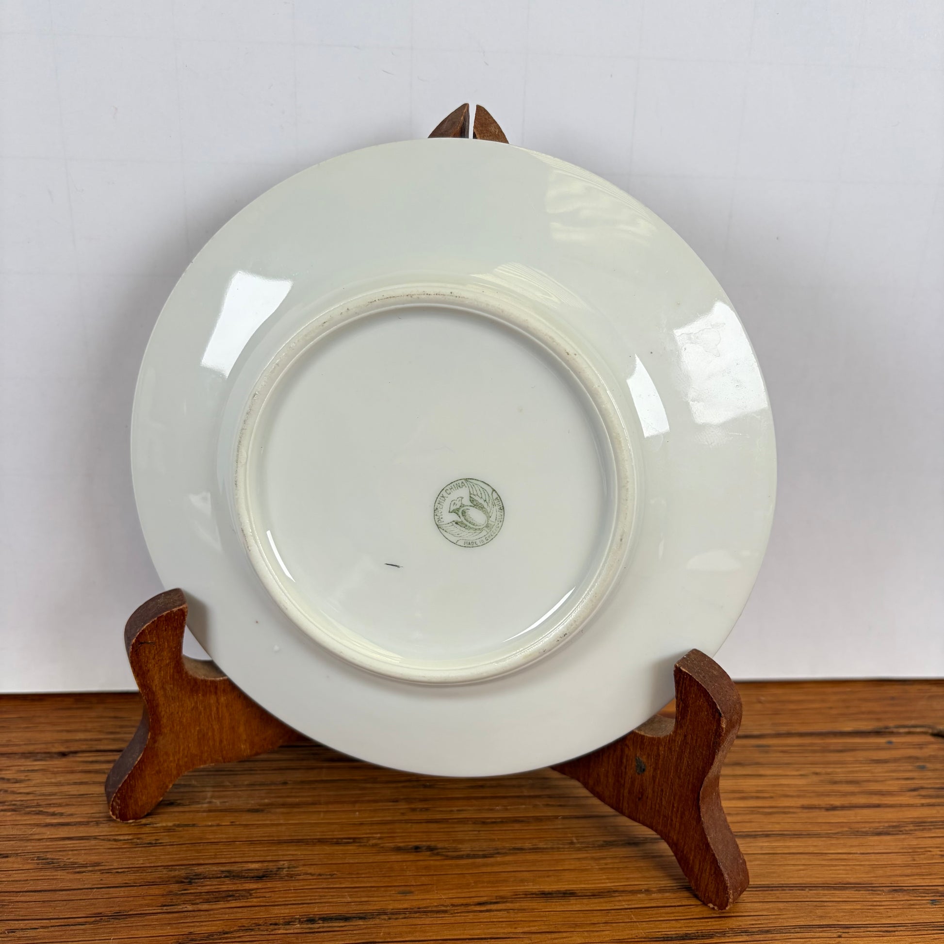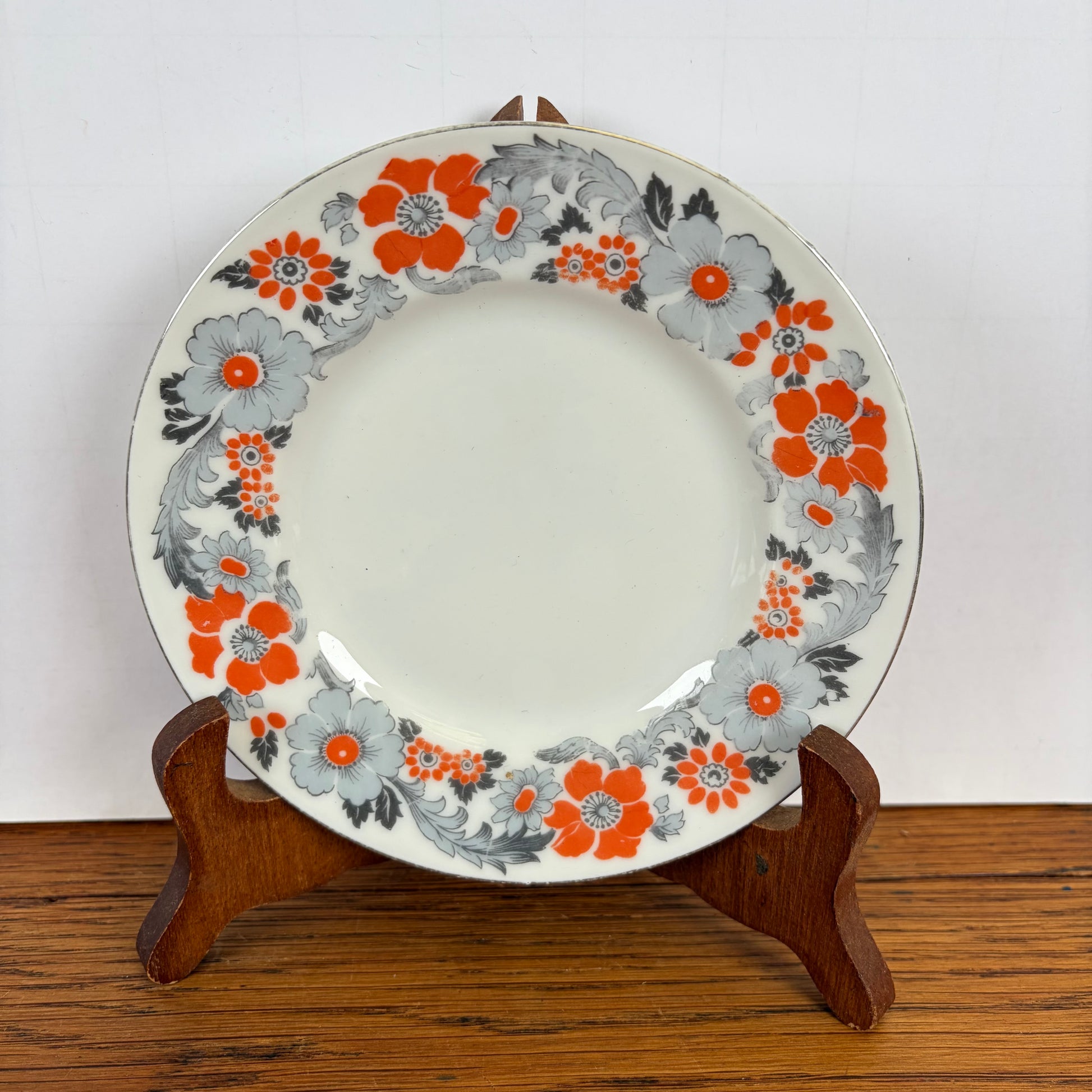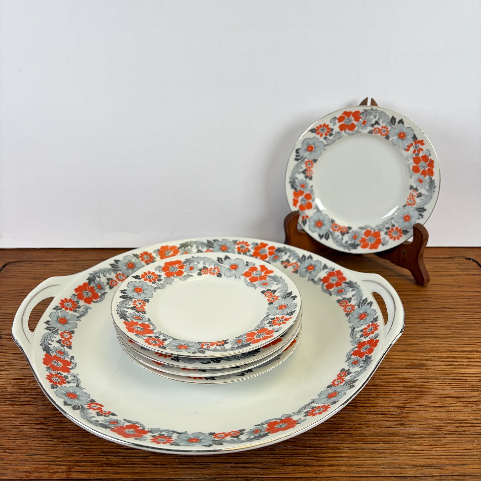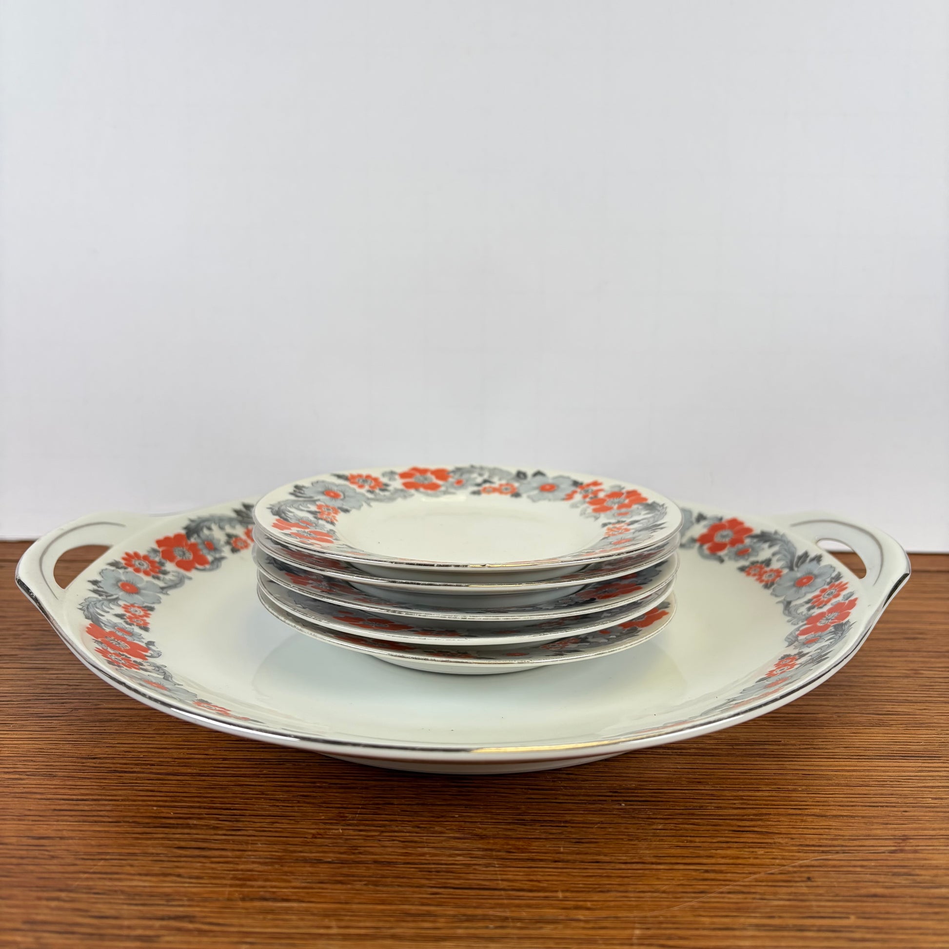 - Mooie bloemenrand zowel op de schaal als de bordjes in grijs rode kleuren