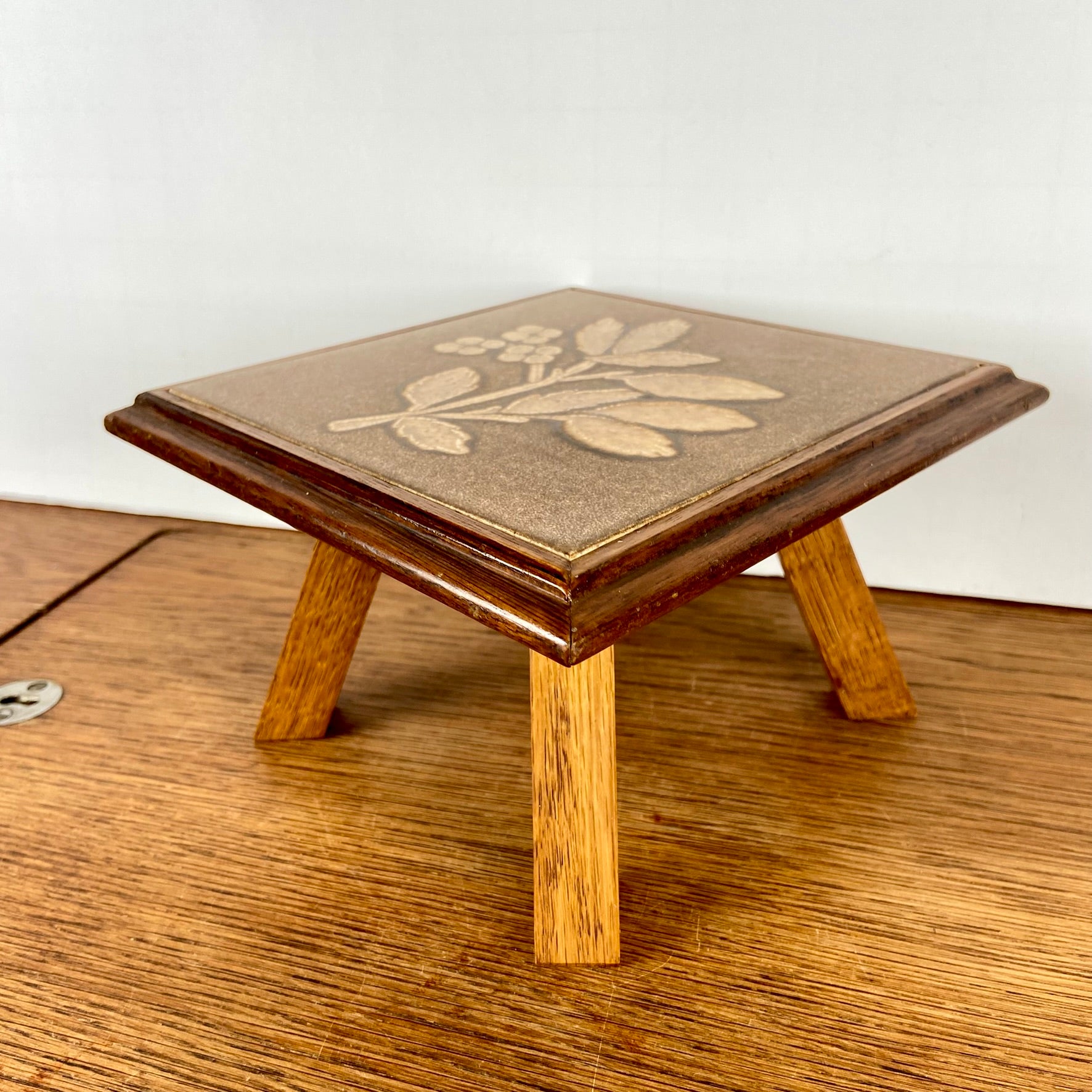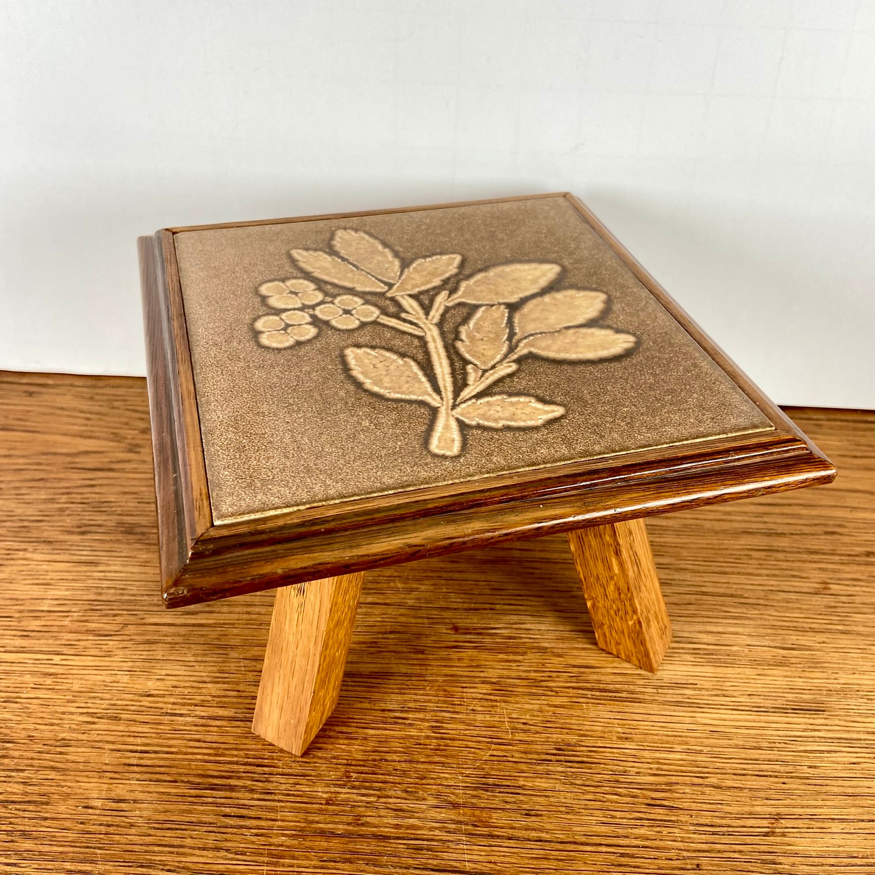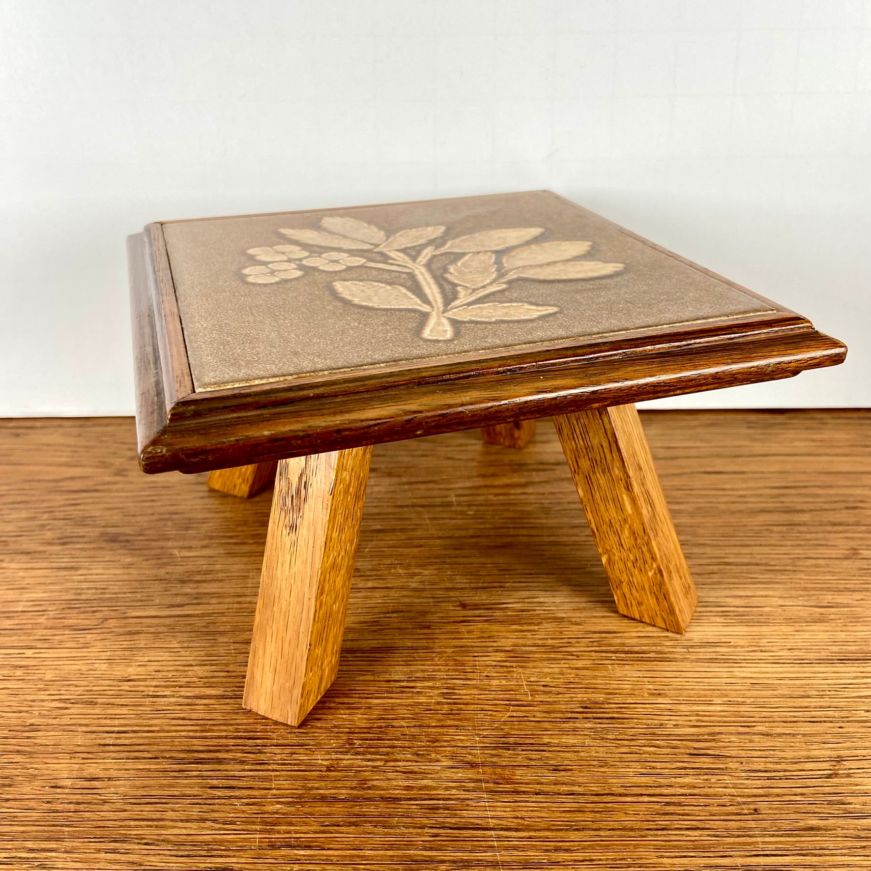 - Houten tafeltje met een stevige tegel bovenop een prent van een tak met bladeren en bloemetjes.