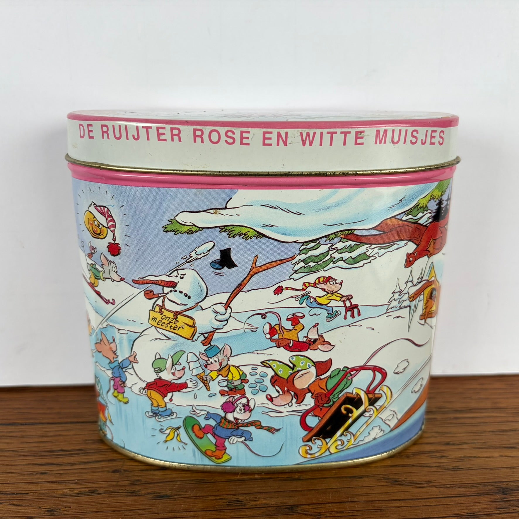 - Geweldig blikje met een prent rondom van spelende muisjes in de sneeuw