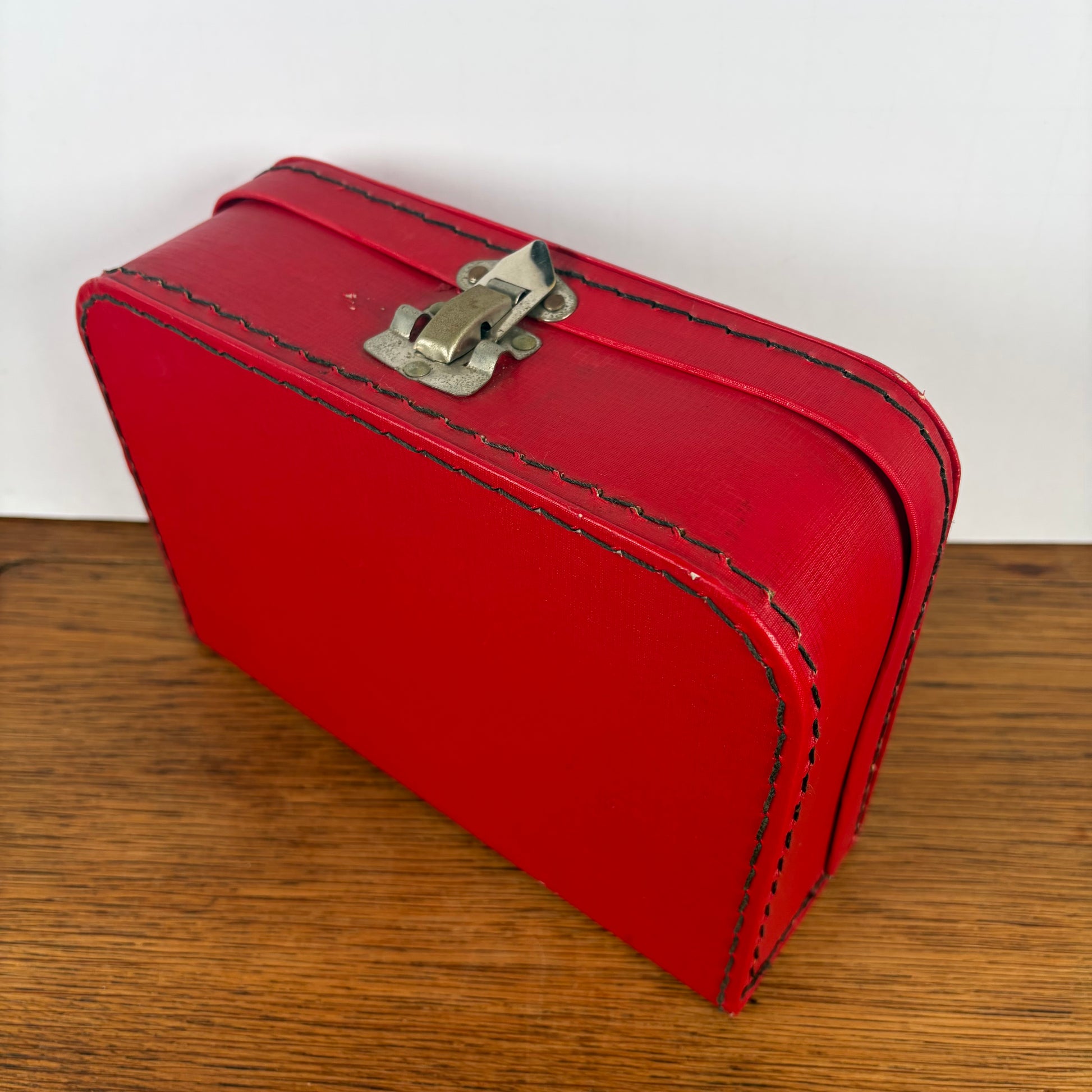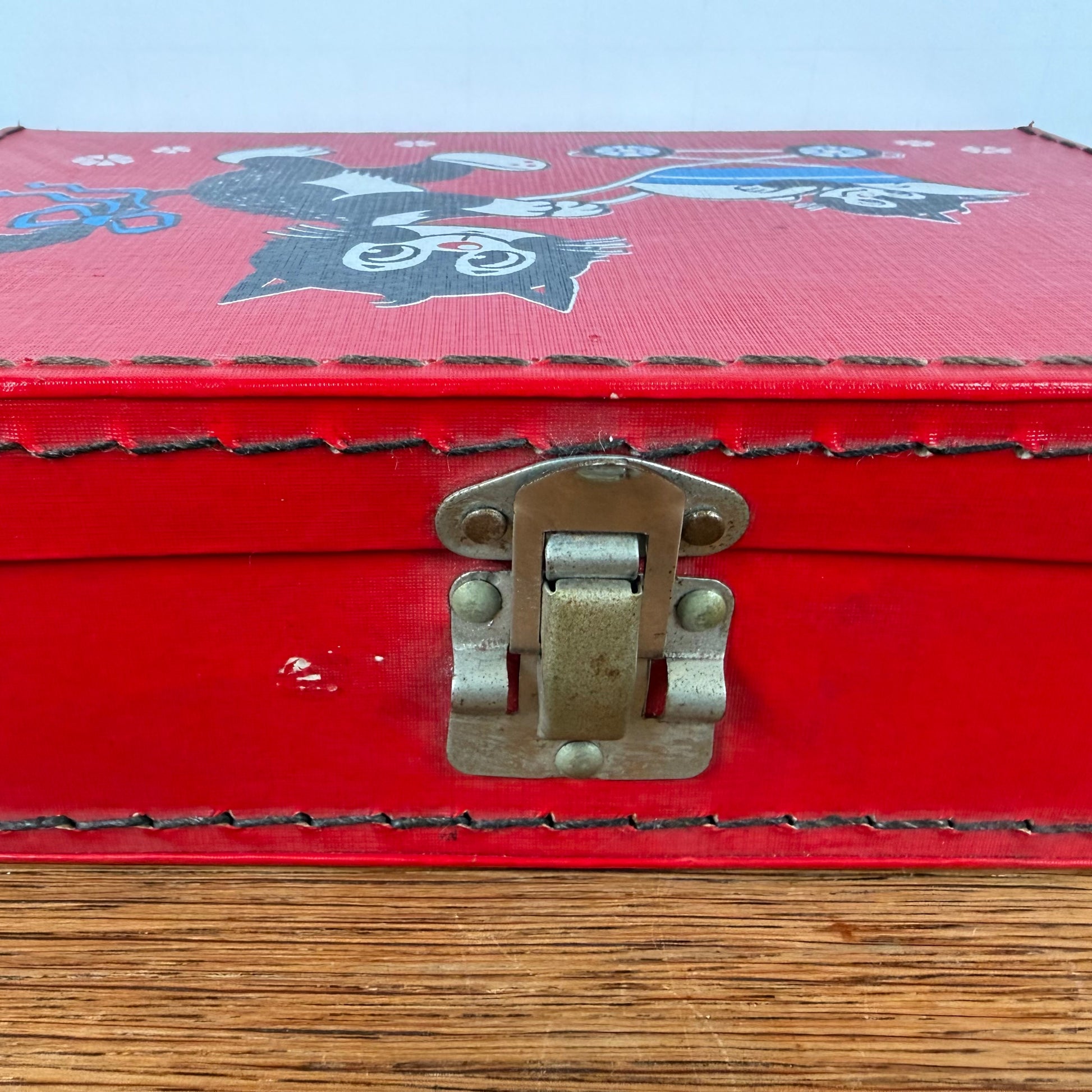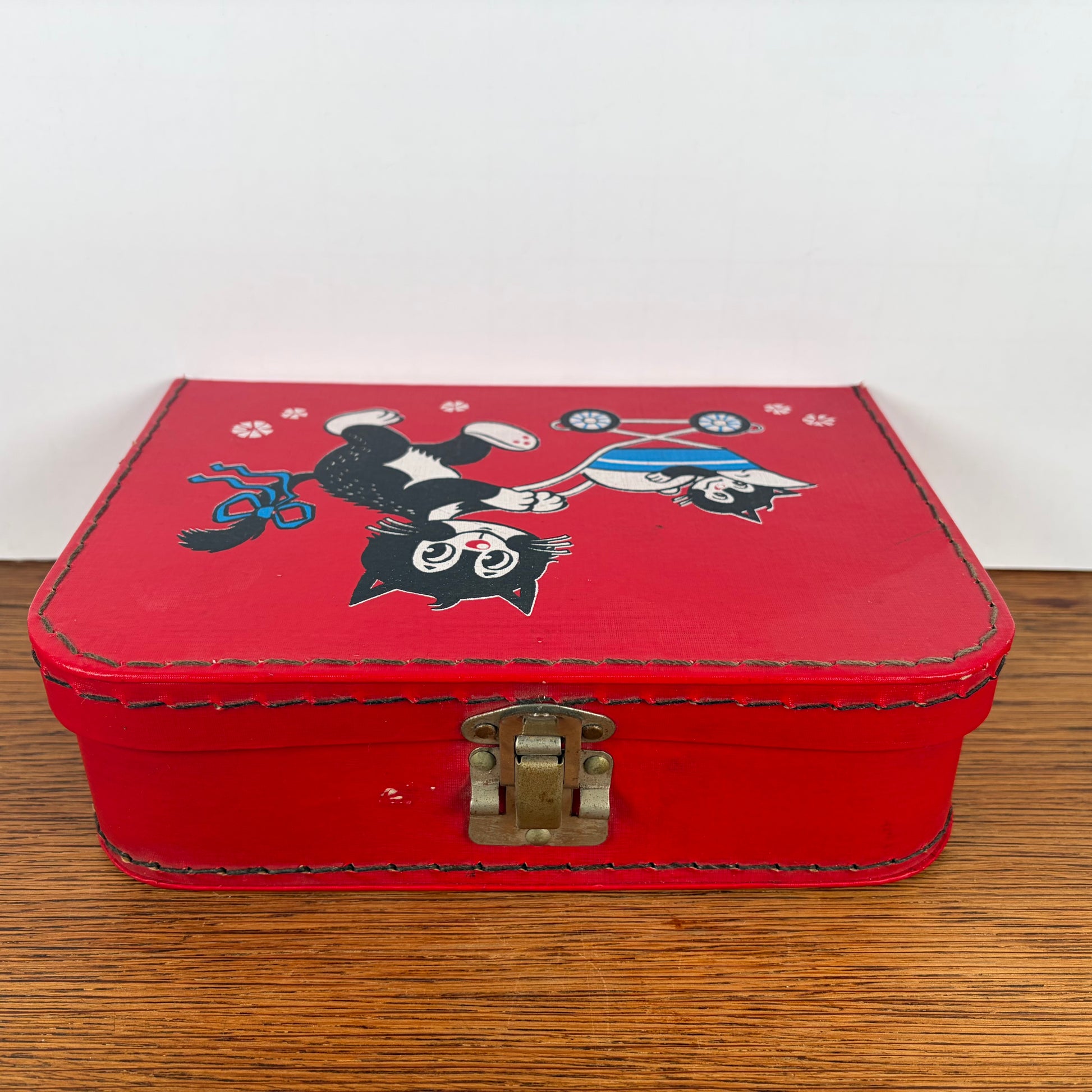 - Vintage rood kinderkoffertje met de afbeelding van een moeder poes met haar kitten in de kinderwagen.