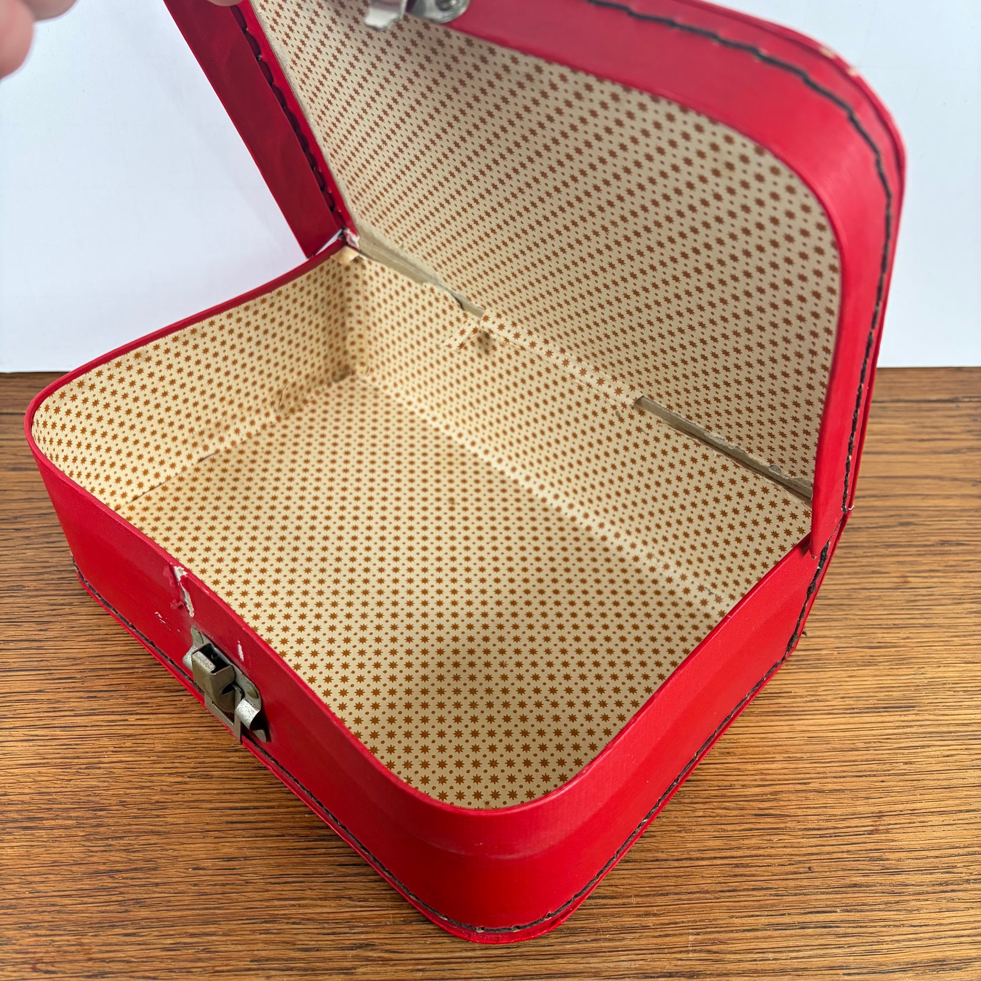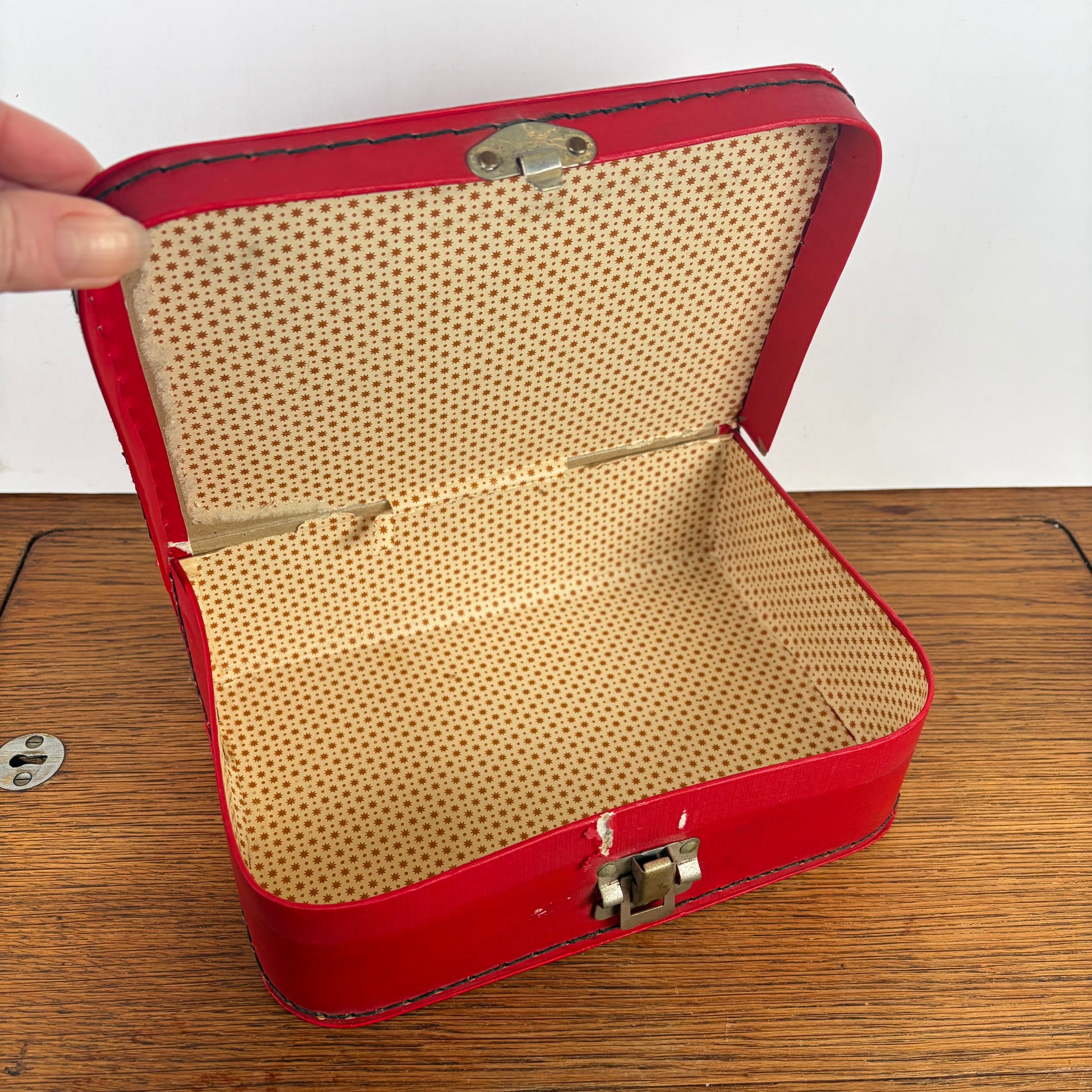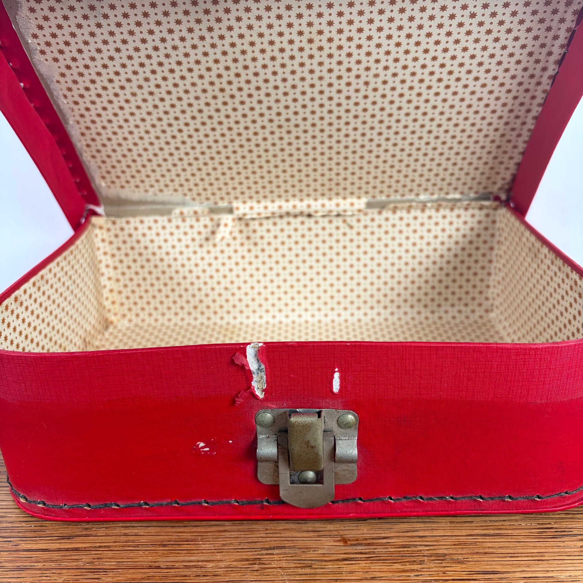 - Vintage rood kinderkoffertje met de afbeelding van een moeder poes met haar kitten in de kinderwagen.