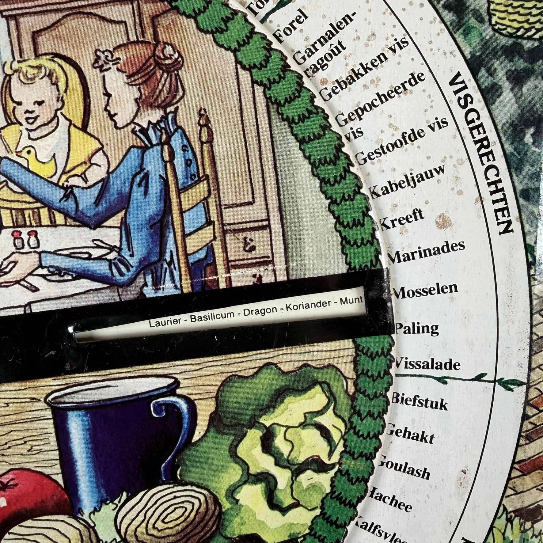 - Het binnenste rondje kan je ronddraaien, zodat de kruidencombinatie voor het betreffende gerecht tevoorschijn komt.