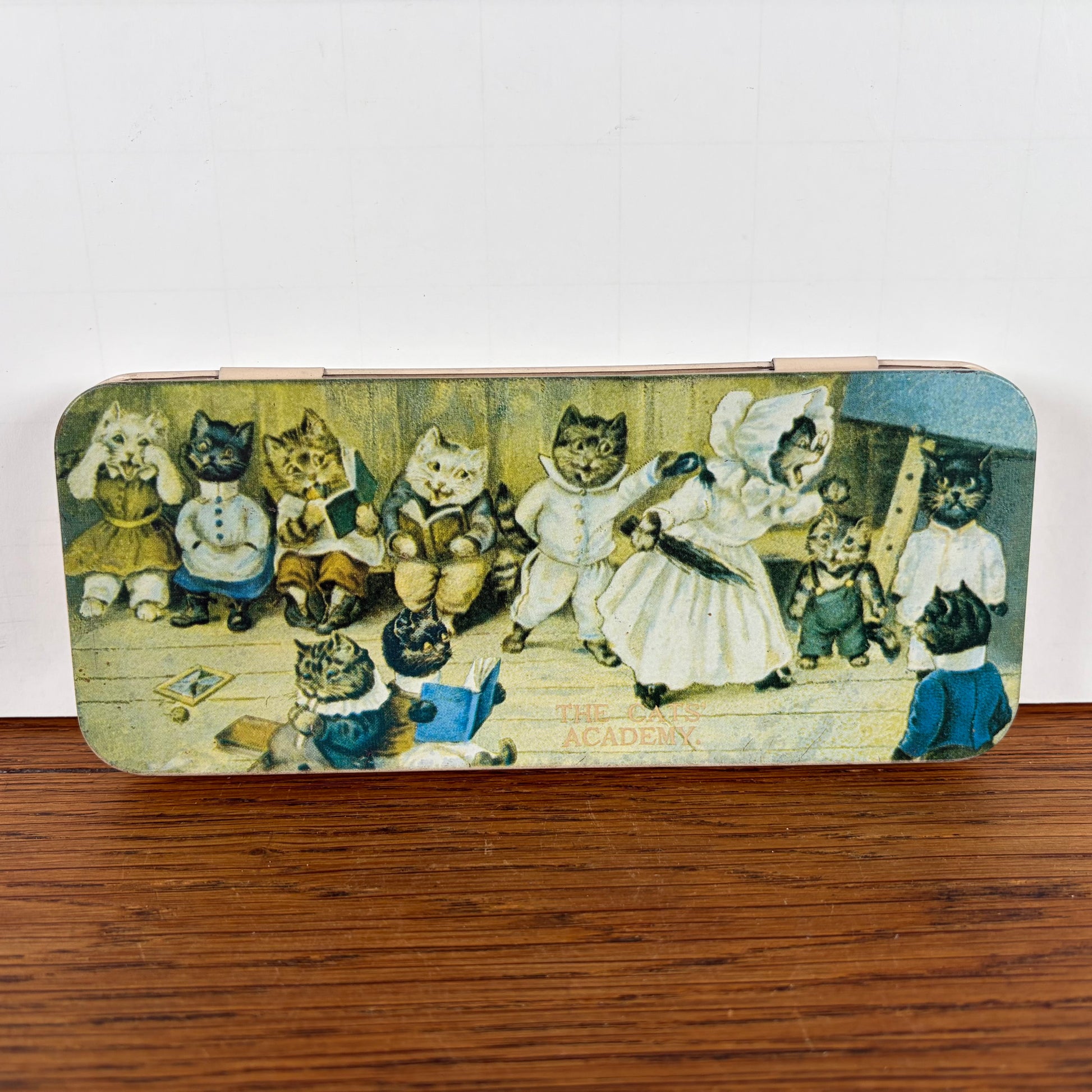 - Vintage pennenblikje met afbeelding van een kattenklasje, The Cats Academy.