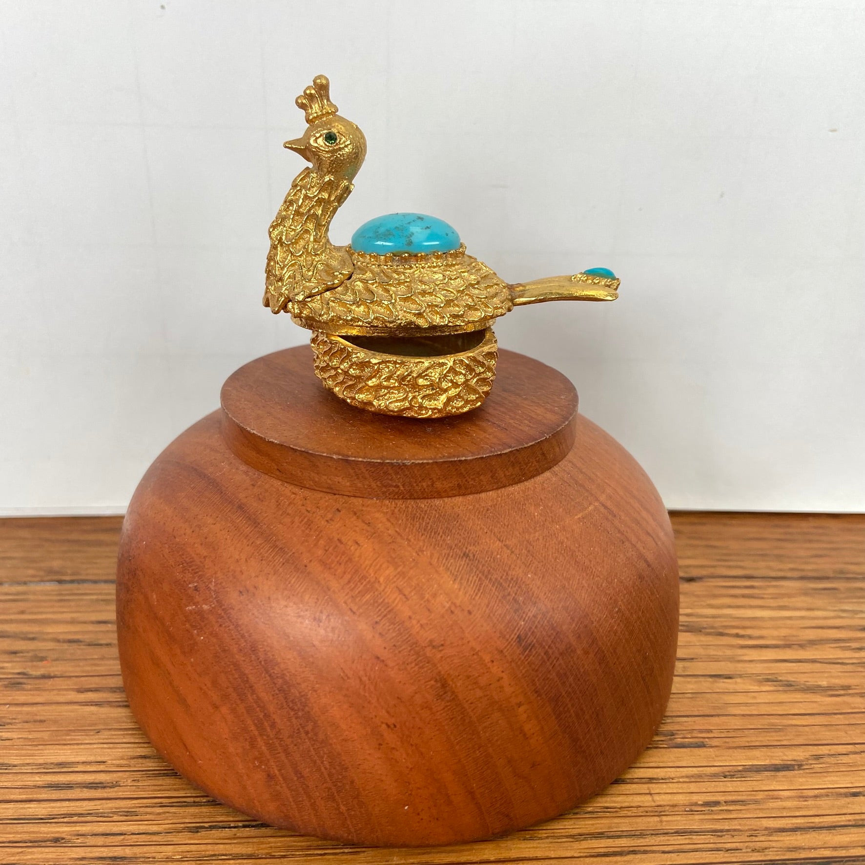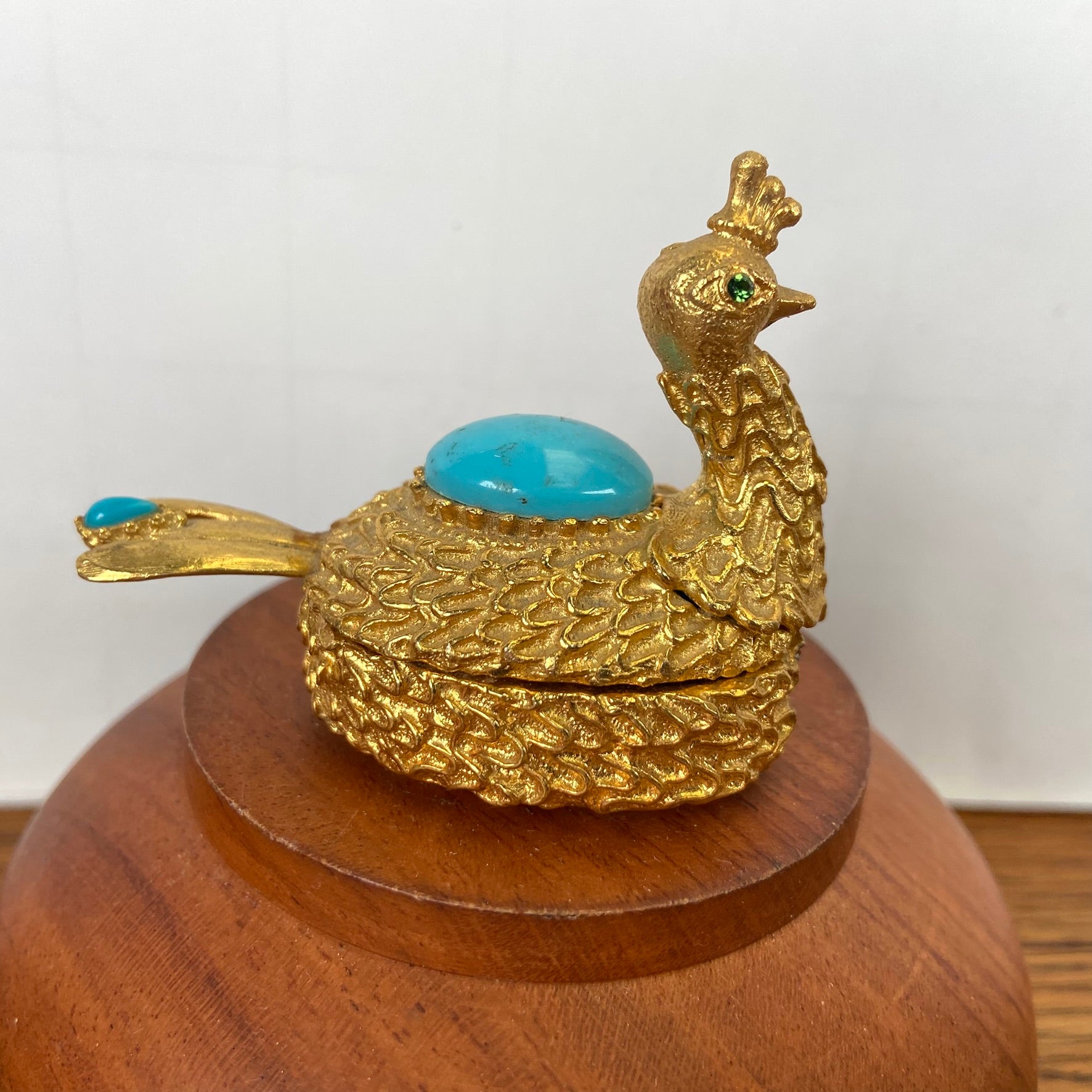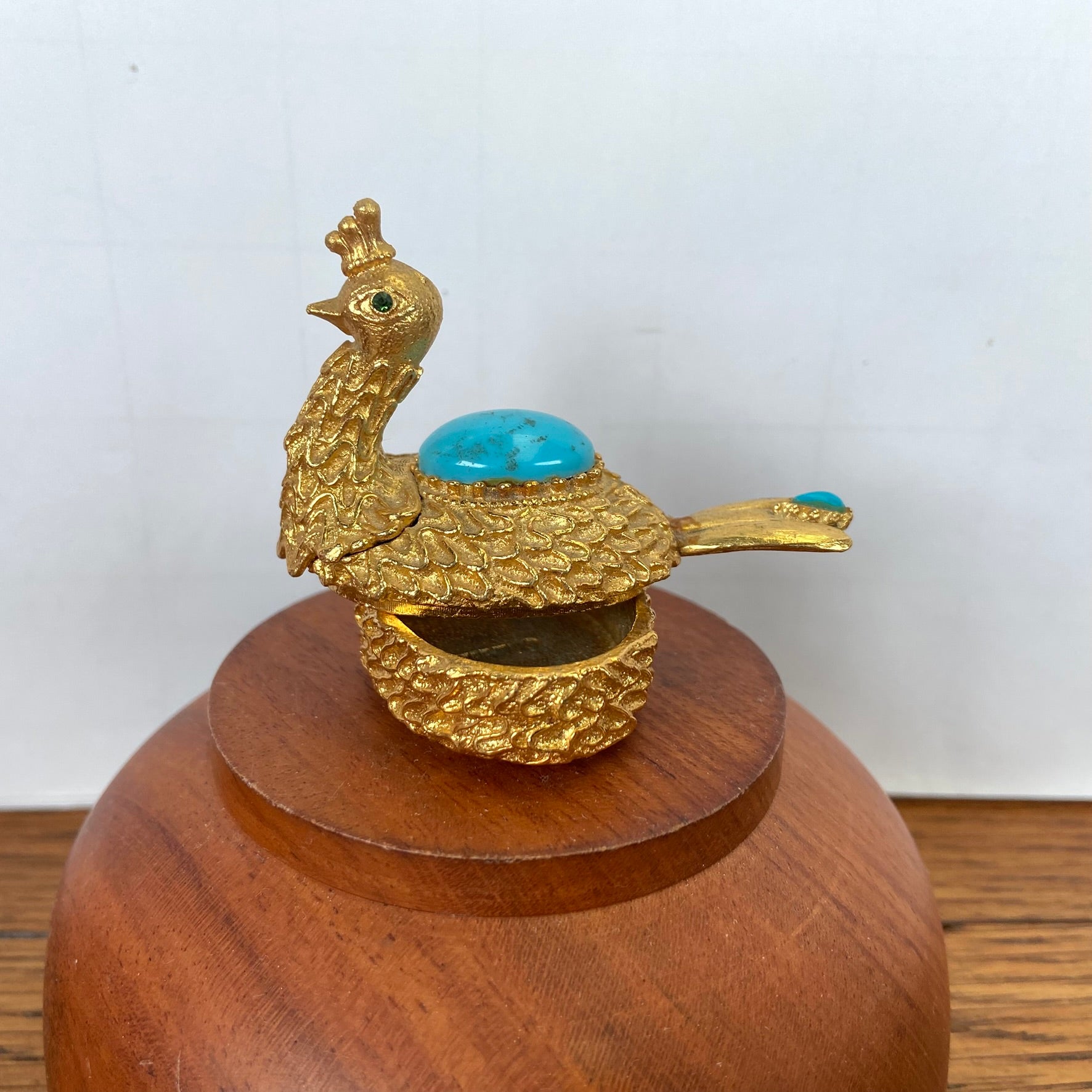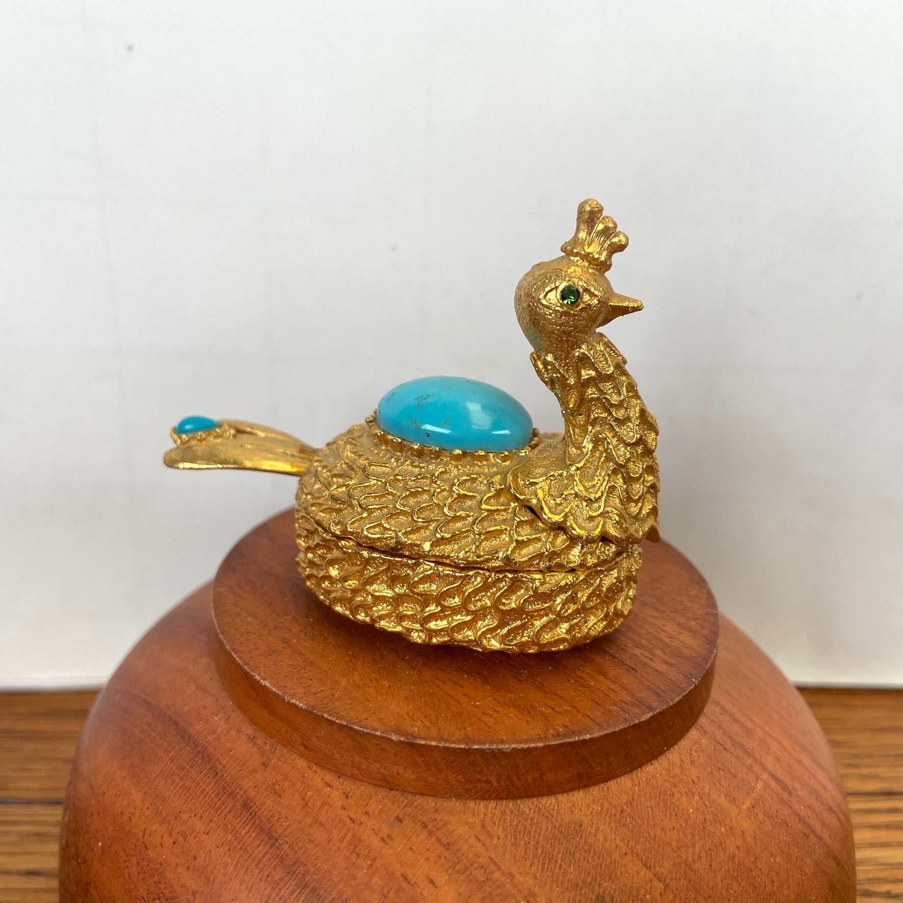 - Goudkleurig pillendoosje of snuisterijen doosje in de vorm van een pauw.