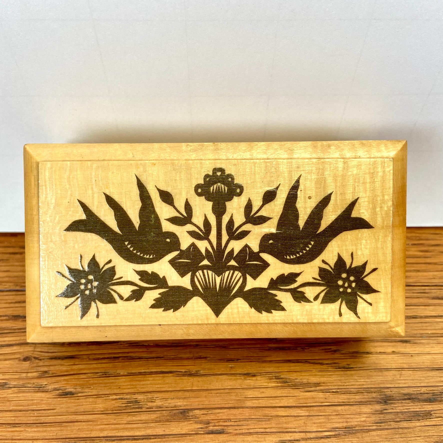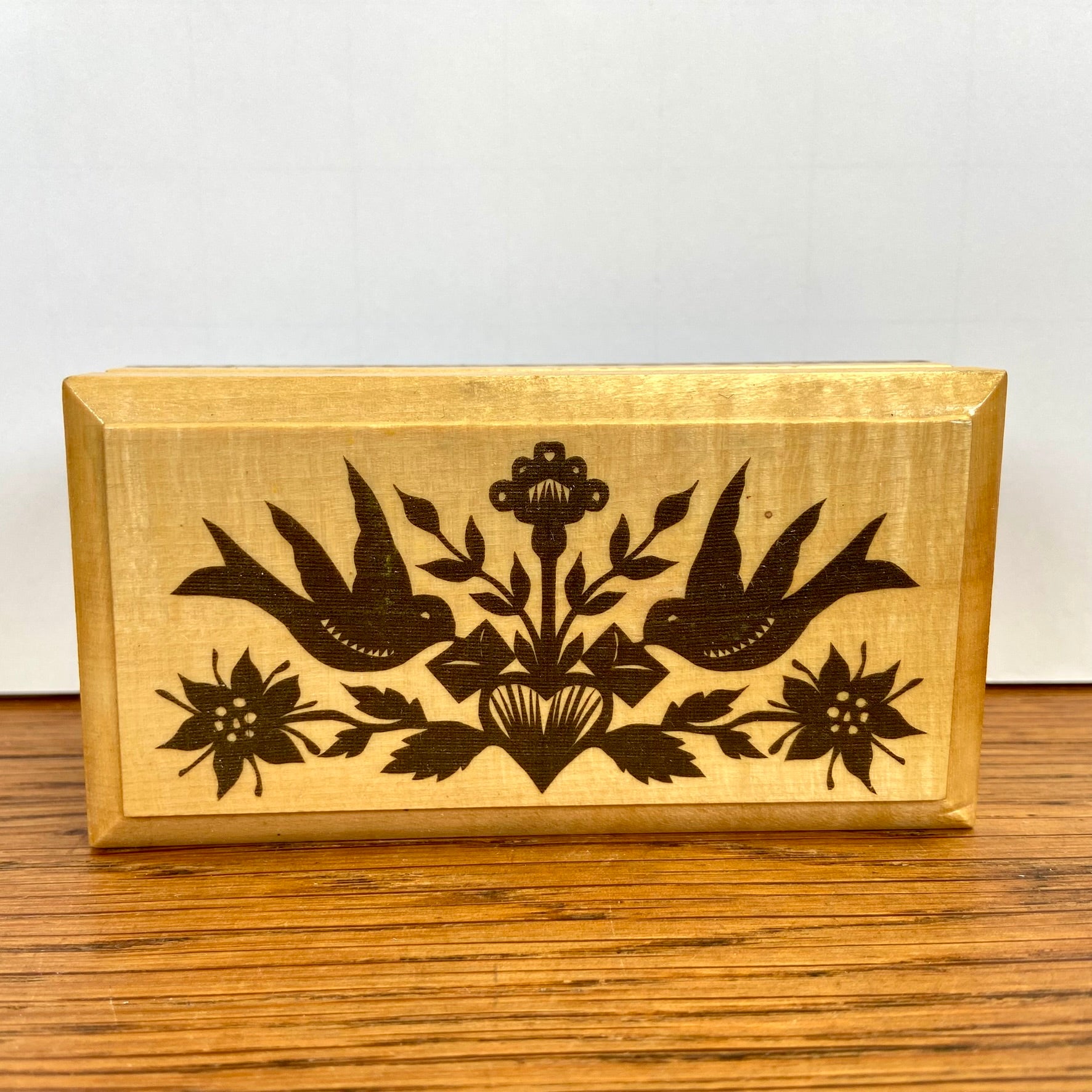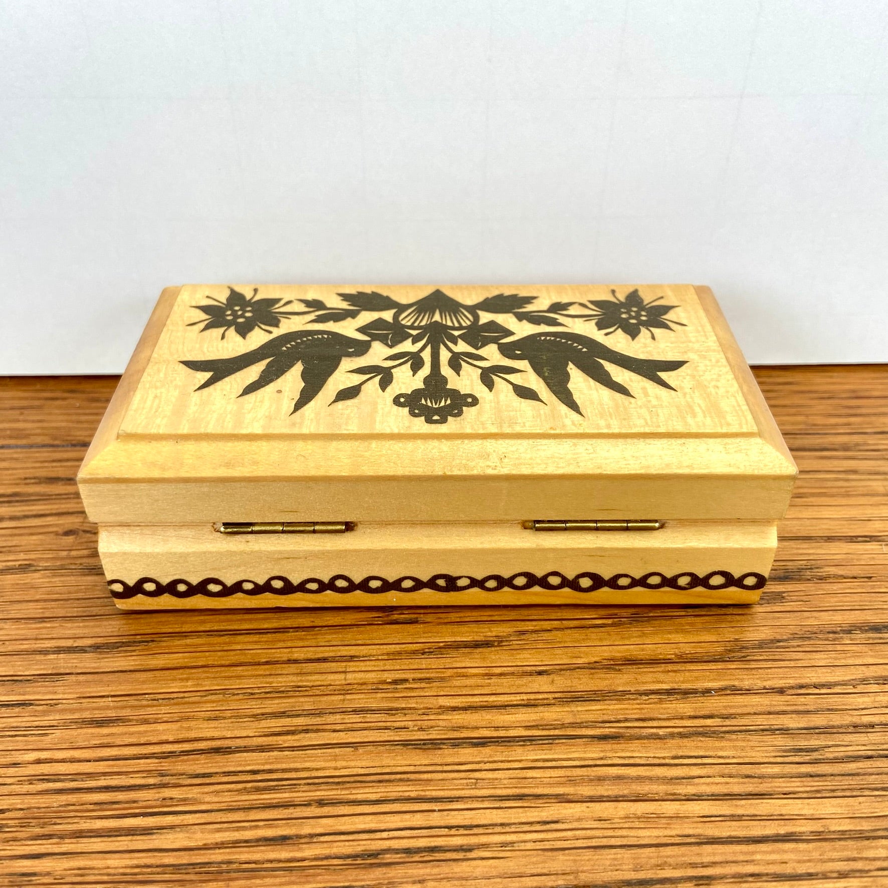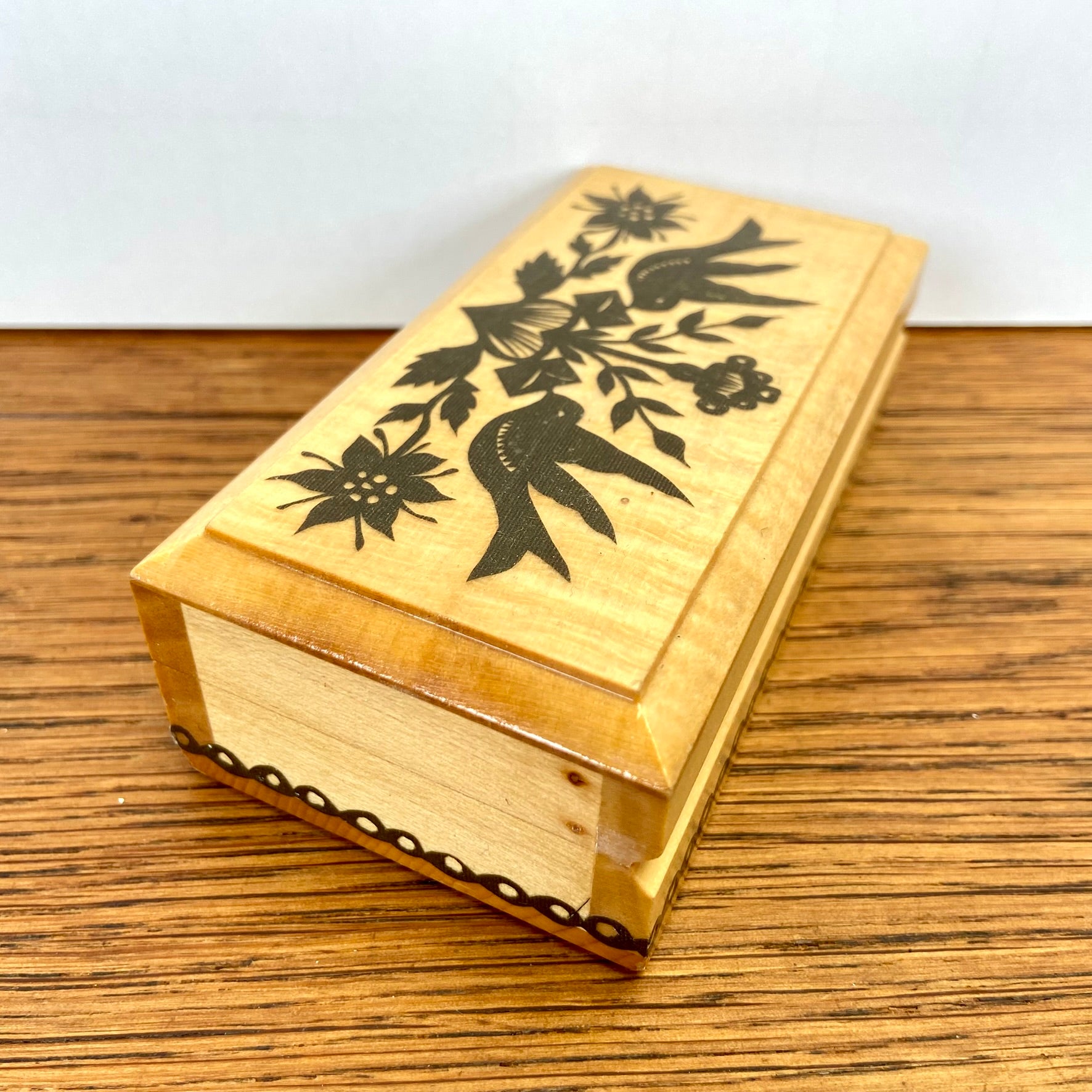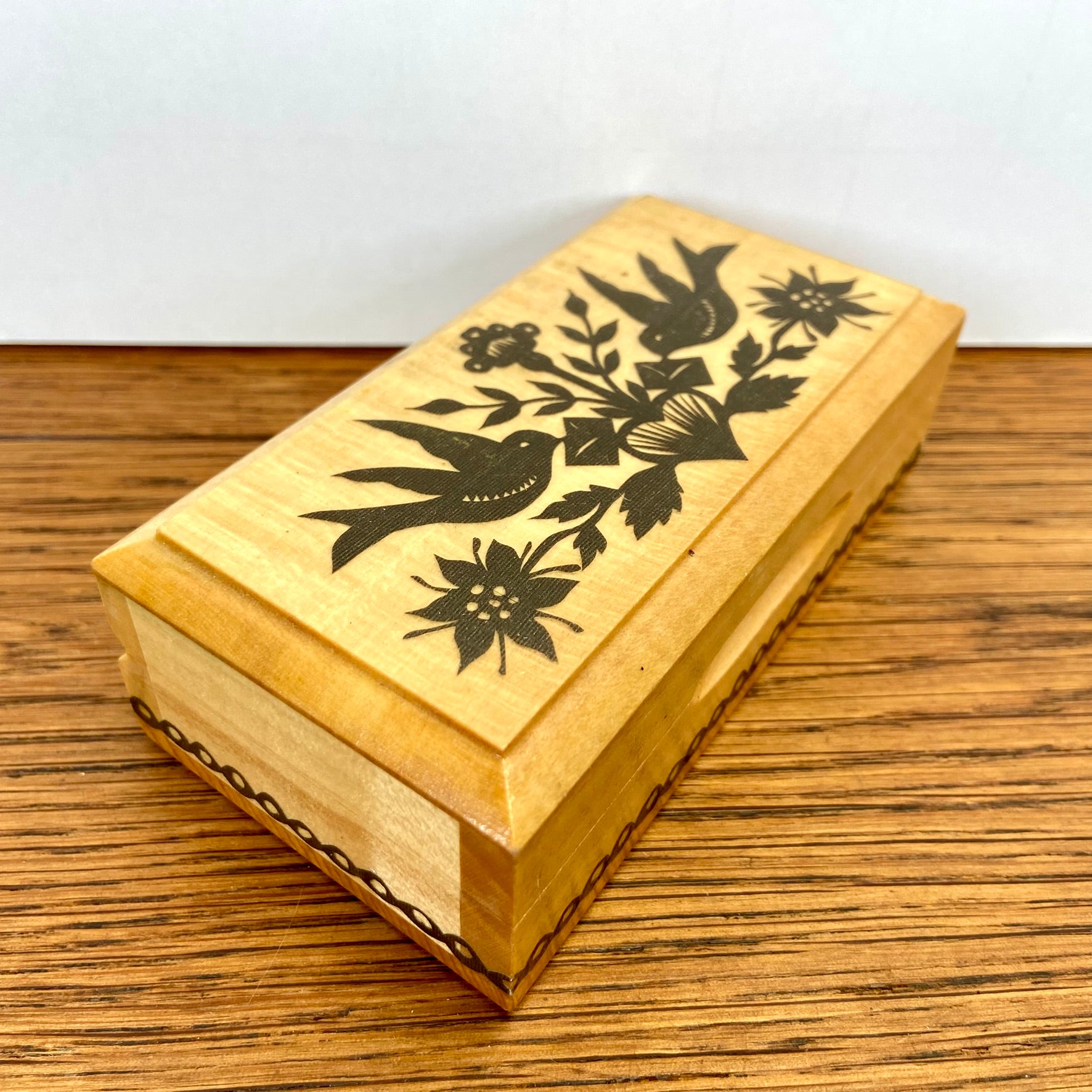 - Houten postzegel doosje met vogeltjes op de bovenkant.