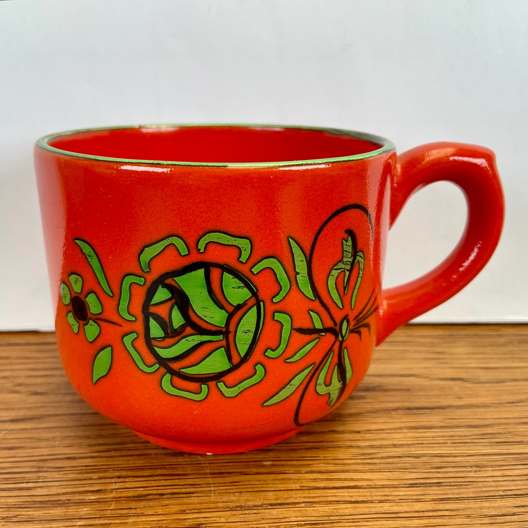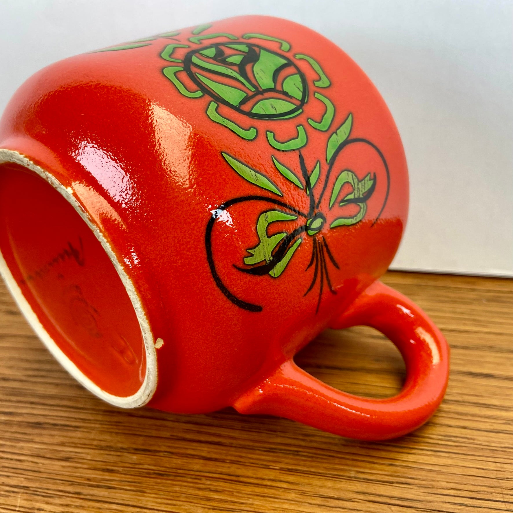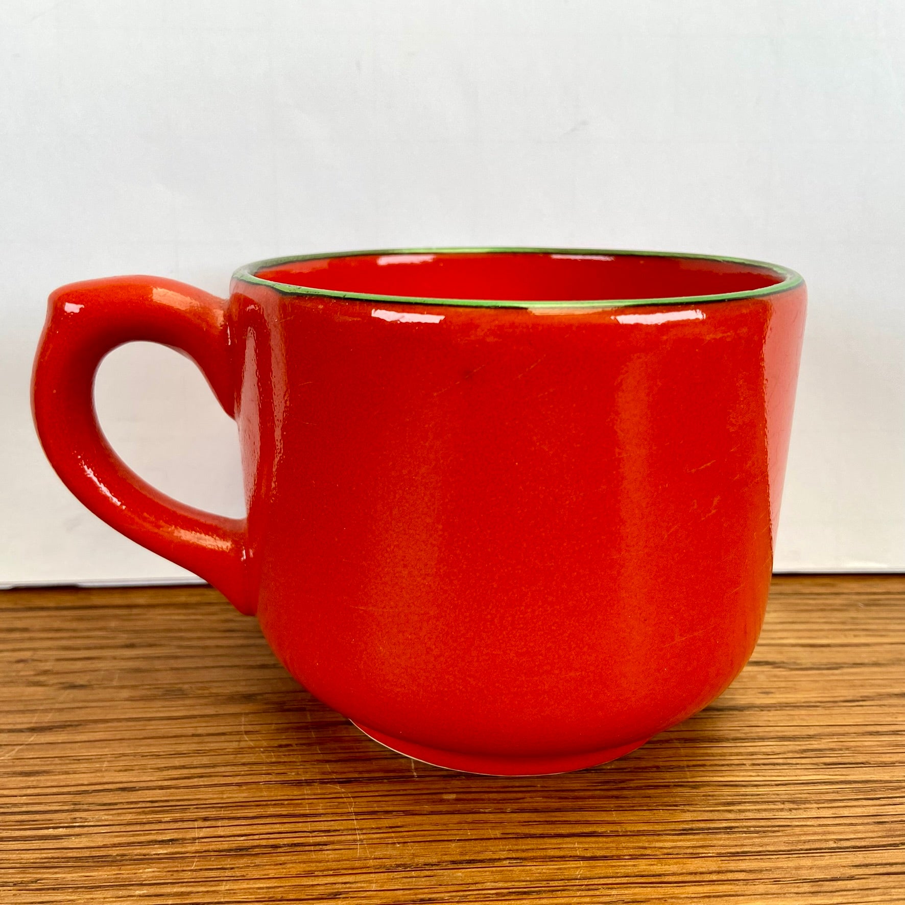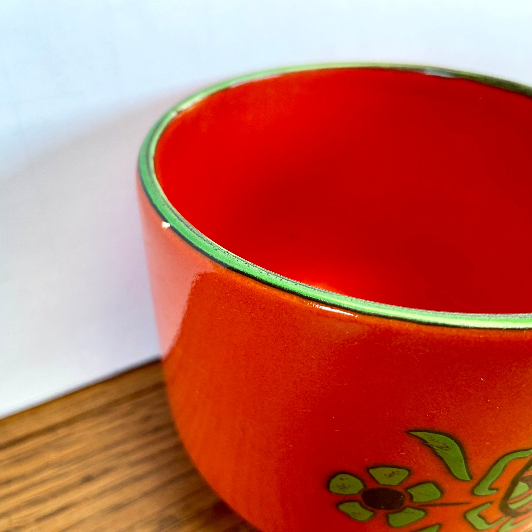 - Geweldige grote rode soepkom met groen - zwarte prent aan de voorkant.