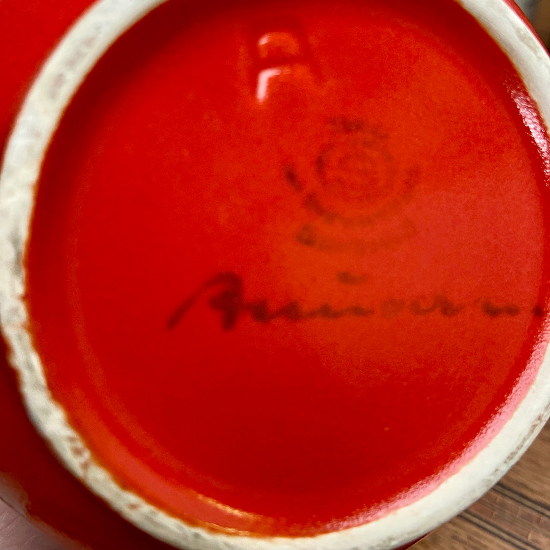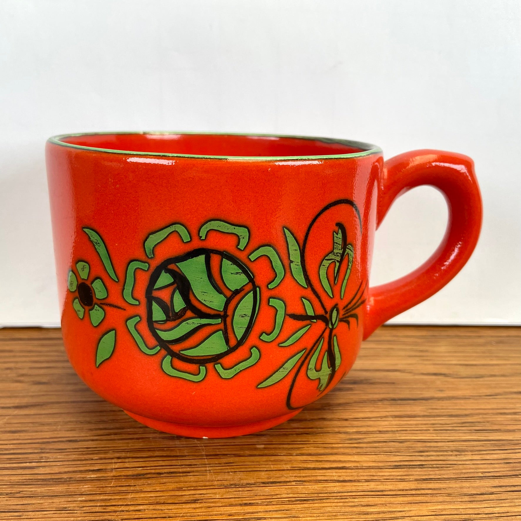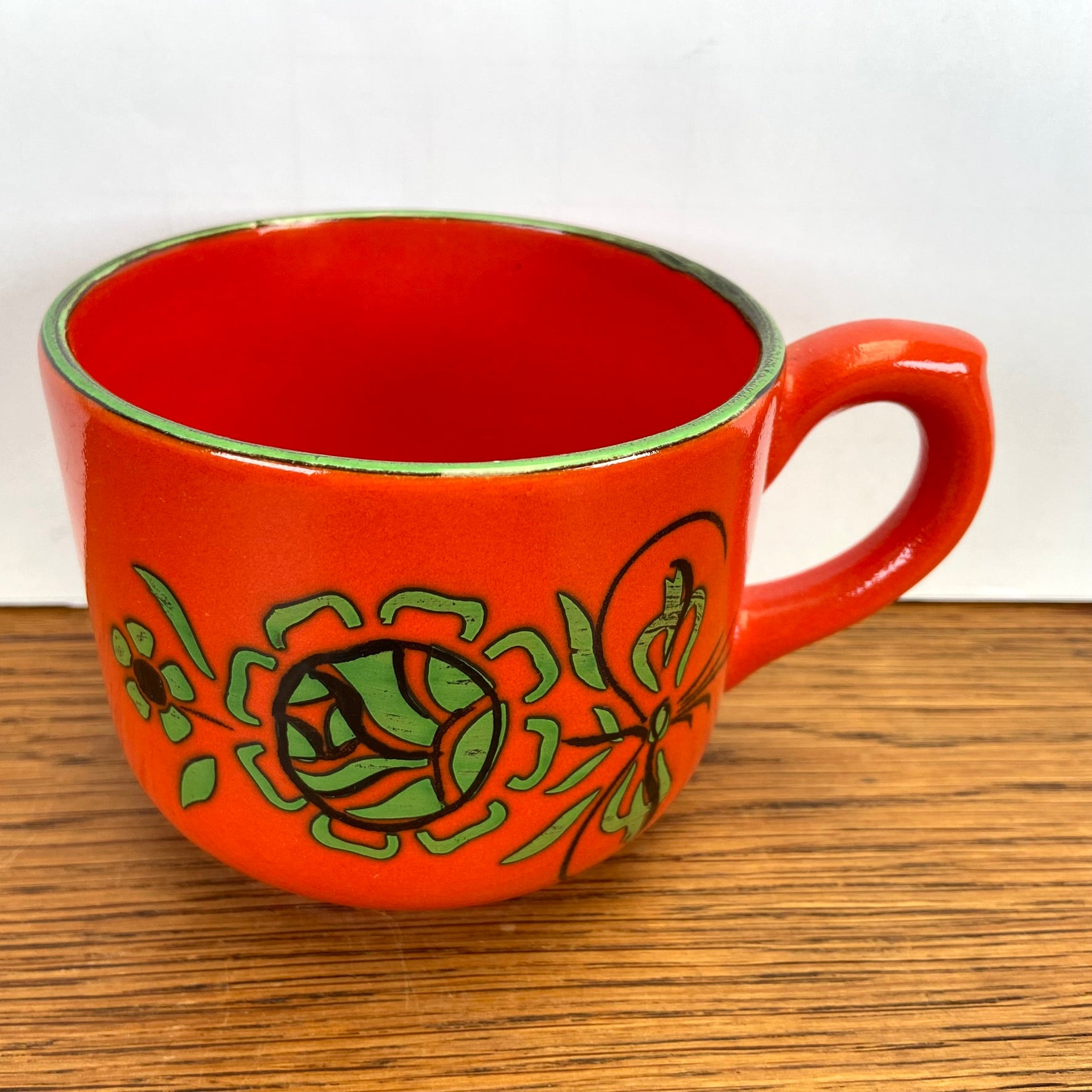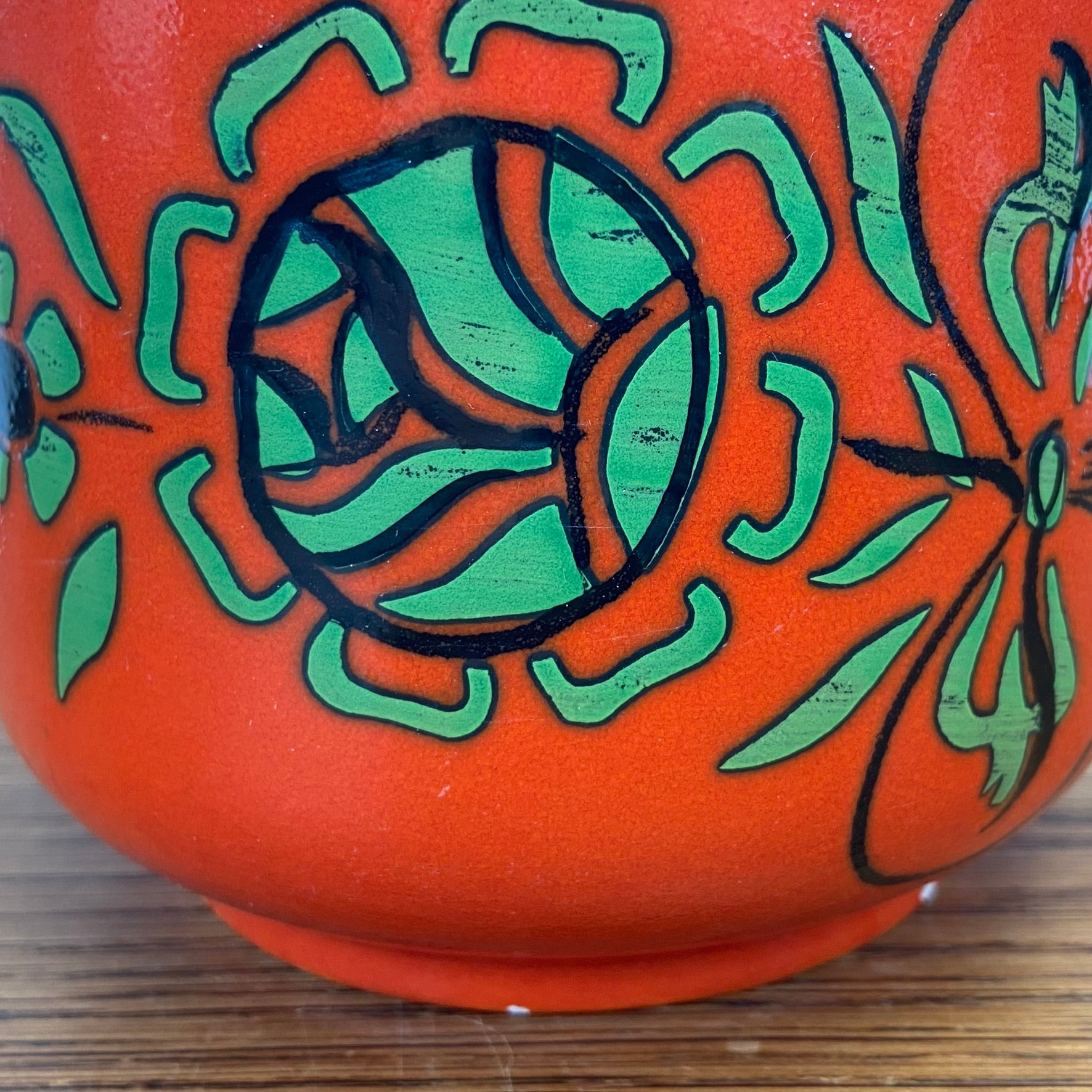 - Geweldige grote rode soepkom met groen - zwarte prent aan de voorkant.