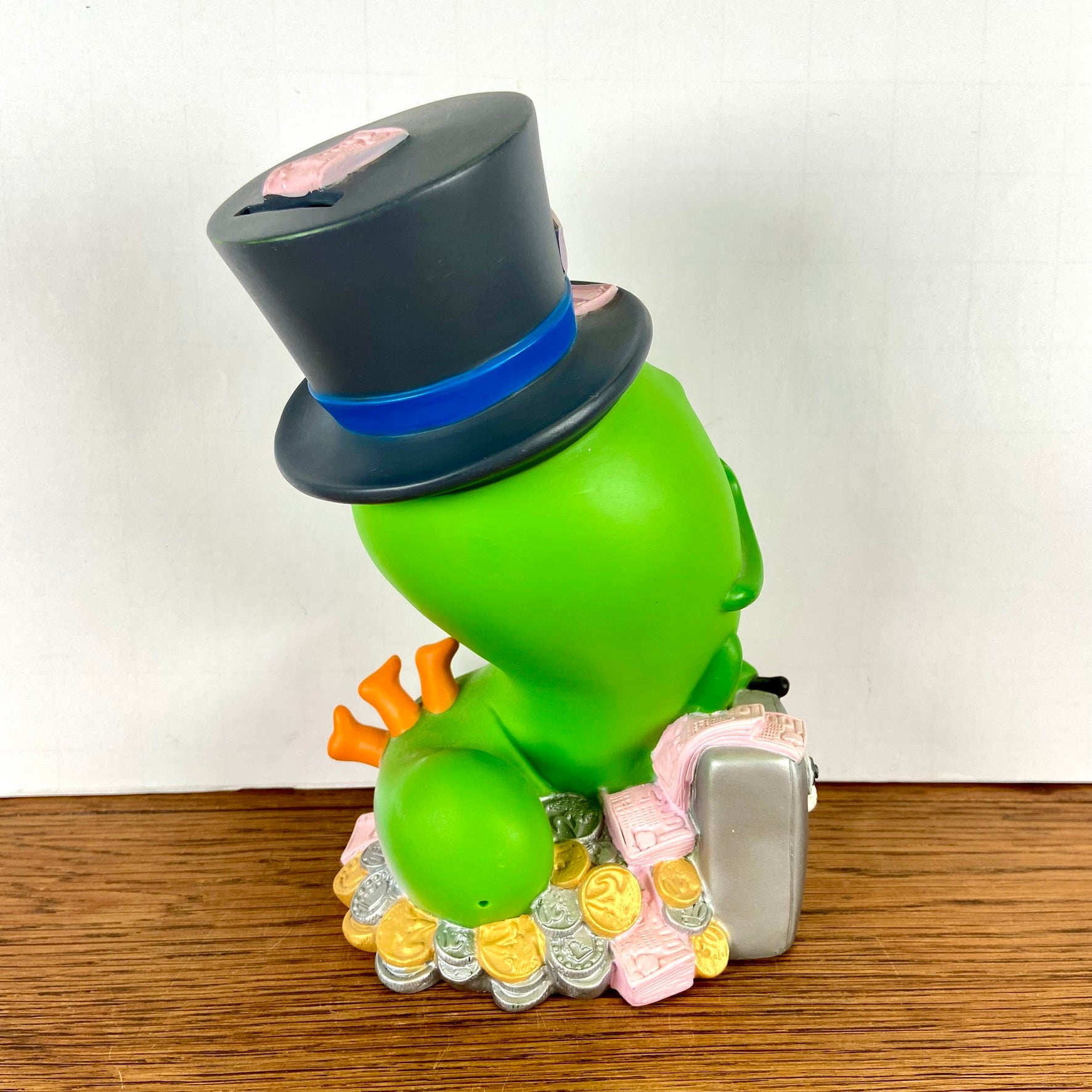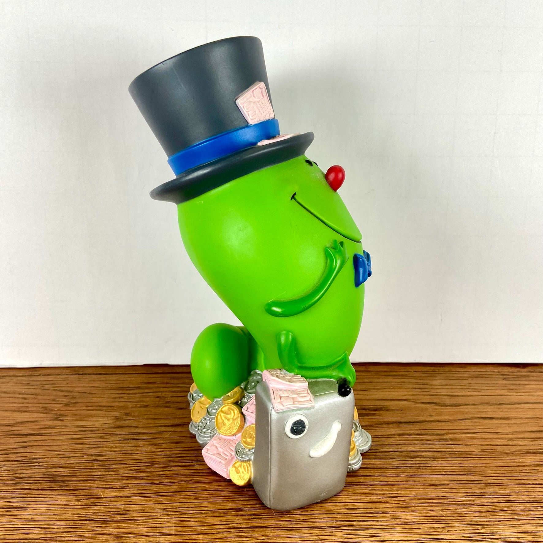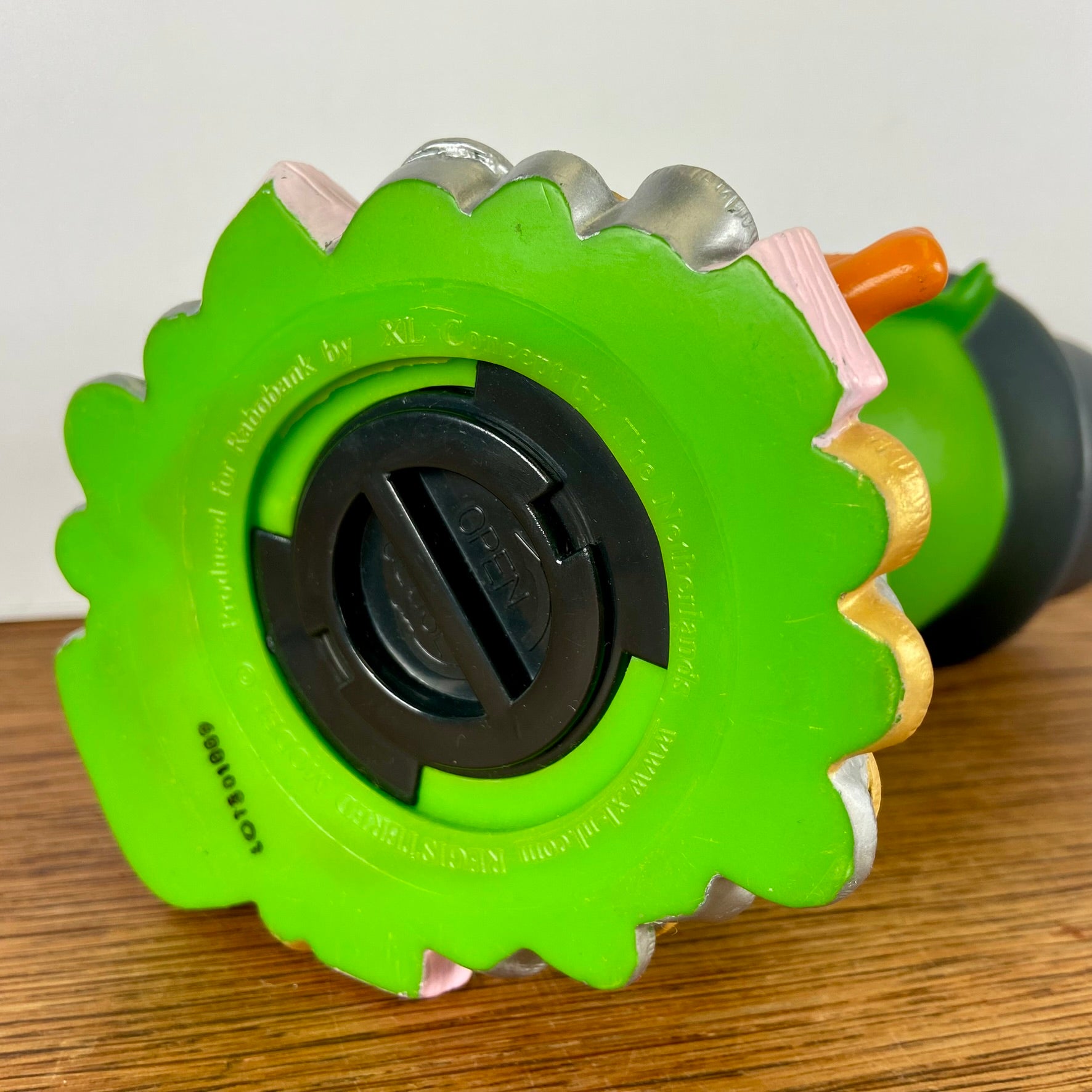 - Deze vrolijke groene rups met hoed is een spaarpot van de Rabobank.