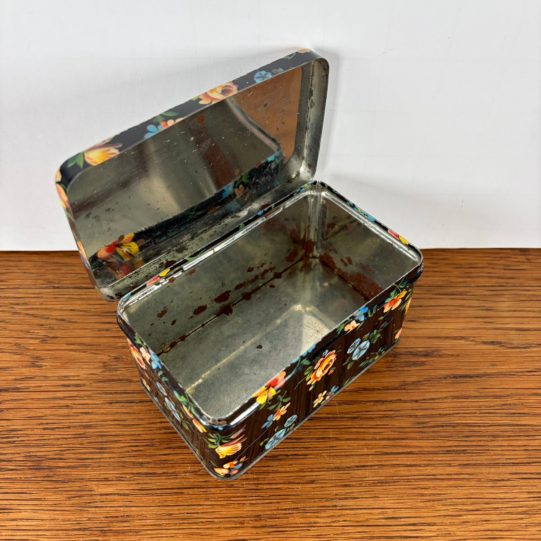- Zwart blikje met blauwe, gele en oranje bloemetjes